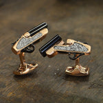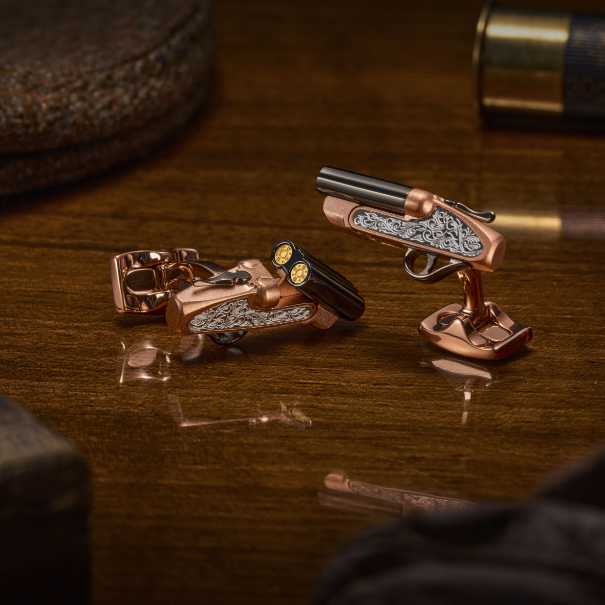 Die typisch englischen Manschettenknöpfe für Schrotflinten im Kaliber 12 von Deakin & Francis bestechen durch ihr markantes Design mit rosévergoldeten Außenseiten und schwarz rhodinierten Läufen. Sie zeigen eine aufwendige seitliche Schlossgravur und ein faszinierendes Merkmal: Wenn Sie den Hebel betätigen, öffnen sich die magnetischen Läufe elegant und geben den Blick auf exquisite vergoldete Patronenkappen frei. Wenn sie nicht in Gebrauch sind, rasten die Läufe sicher ein.