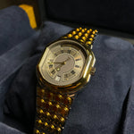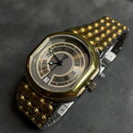 Das Zifferblatt zeigt vintage Tritium-Indizes über den Ziffern und Tritiumgefüllte Zeigerenden – ein seltener und radioaktiver Isotop von Wasserstoff, das in der Vergangenheit als Energiequelle in radiolumineszenten Lichtern für Armbanduhren verwendet wurde, bevor es durch Luminova und später durch Super Luminova ersetzt wurde – das heute kein Licht mehr auf dem Zifferblatt reflektiert, aber eine gewisse Düsternis einfängt.