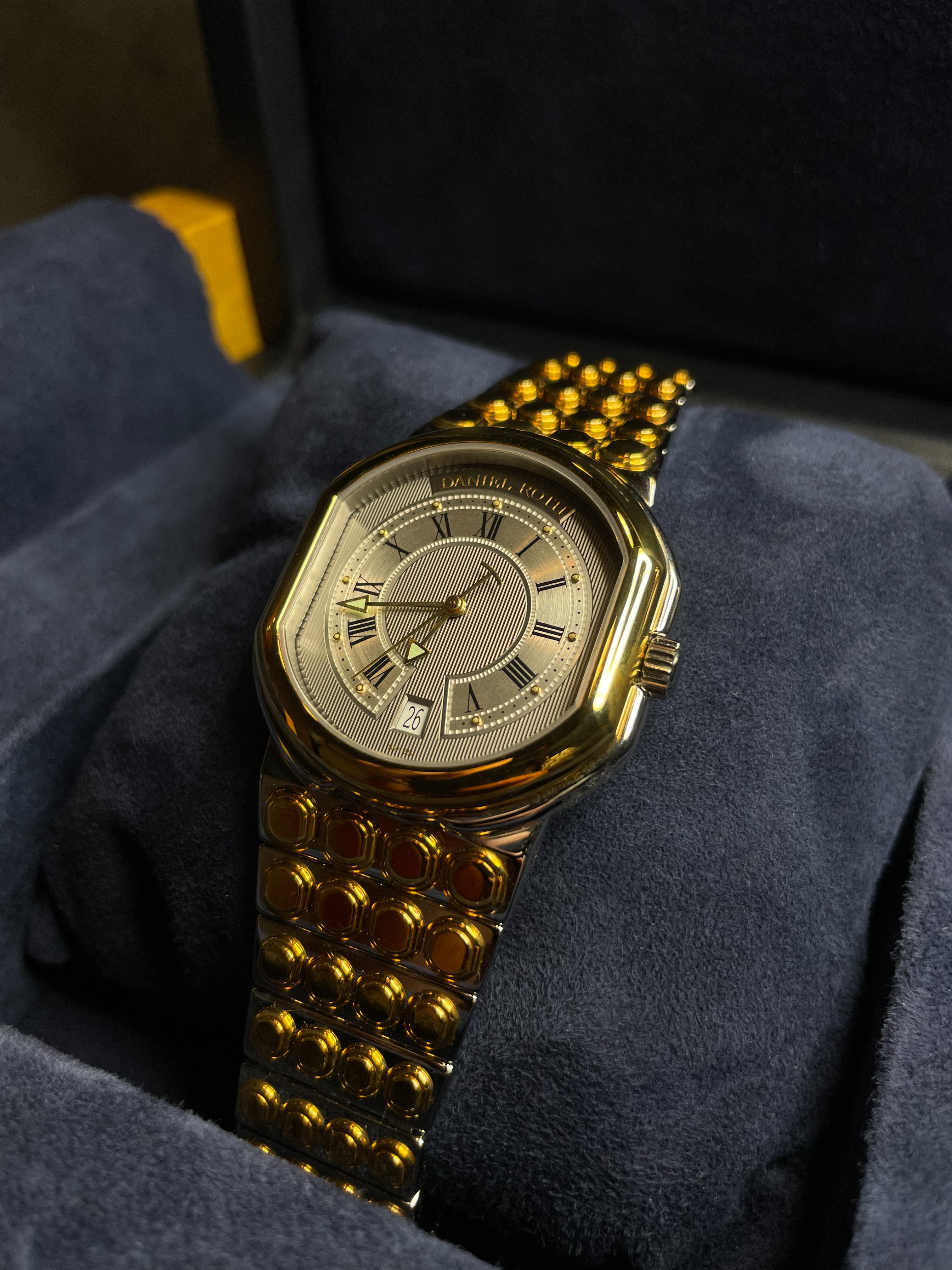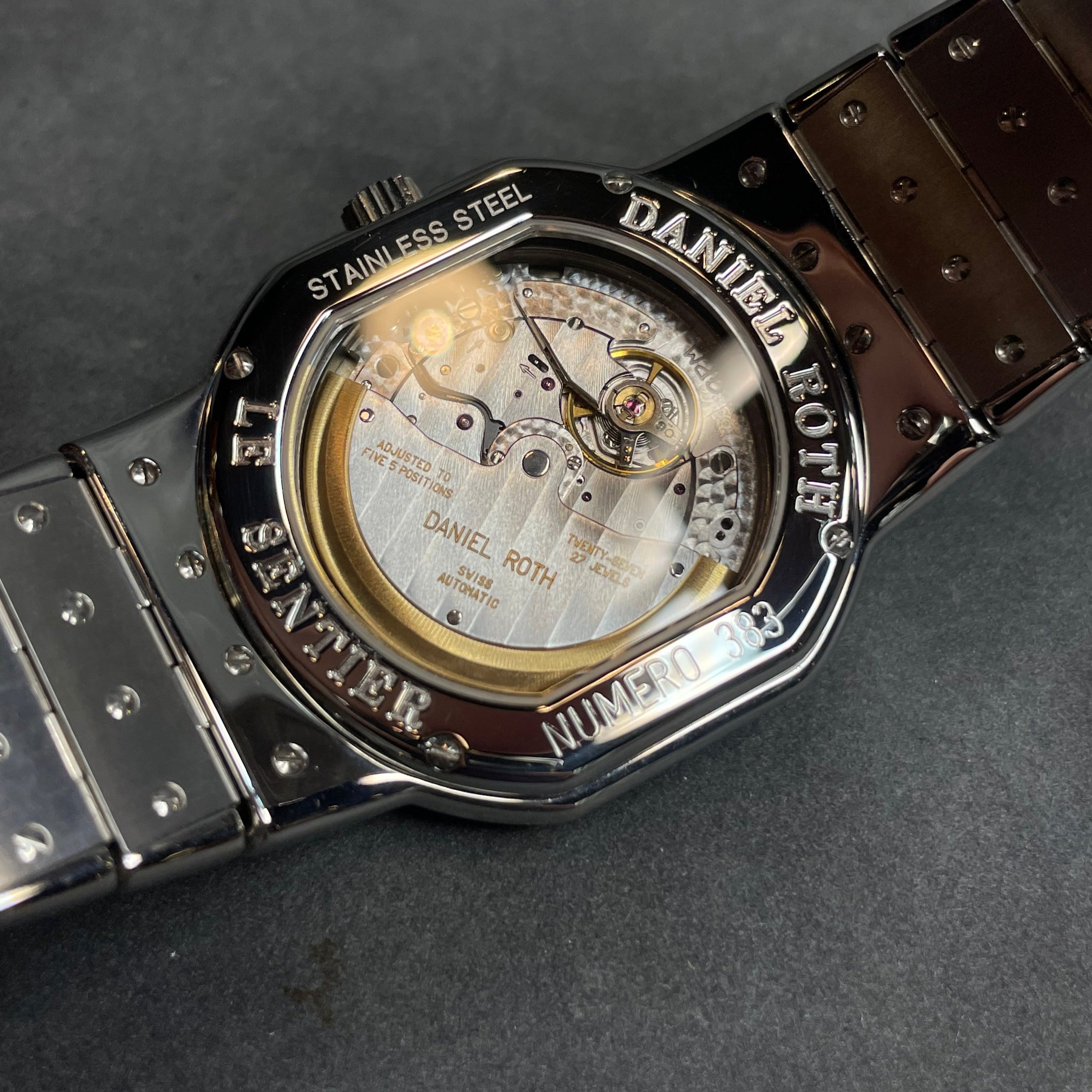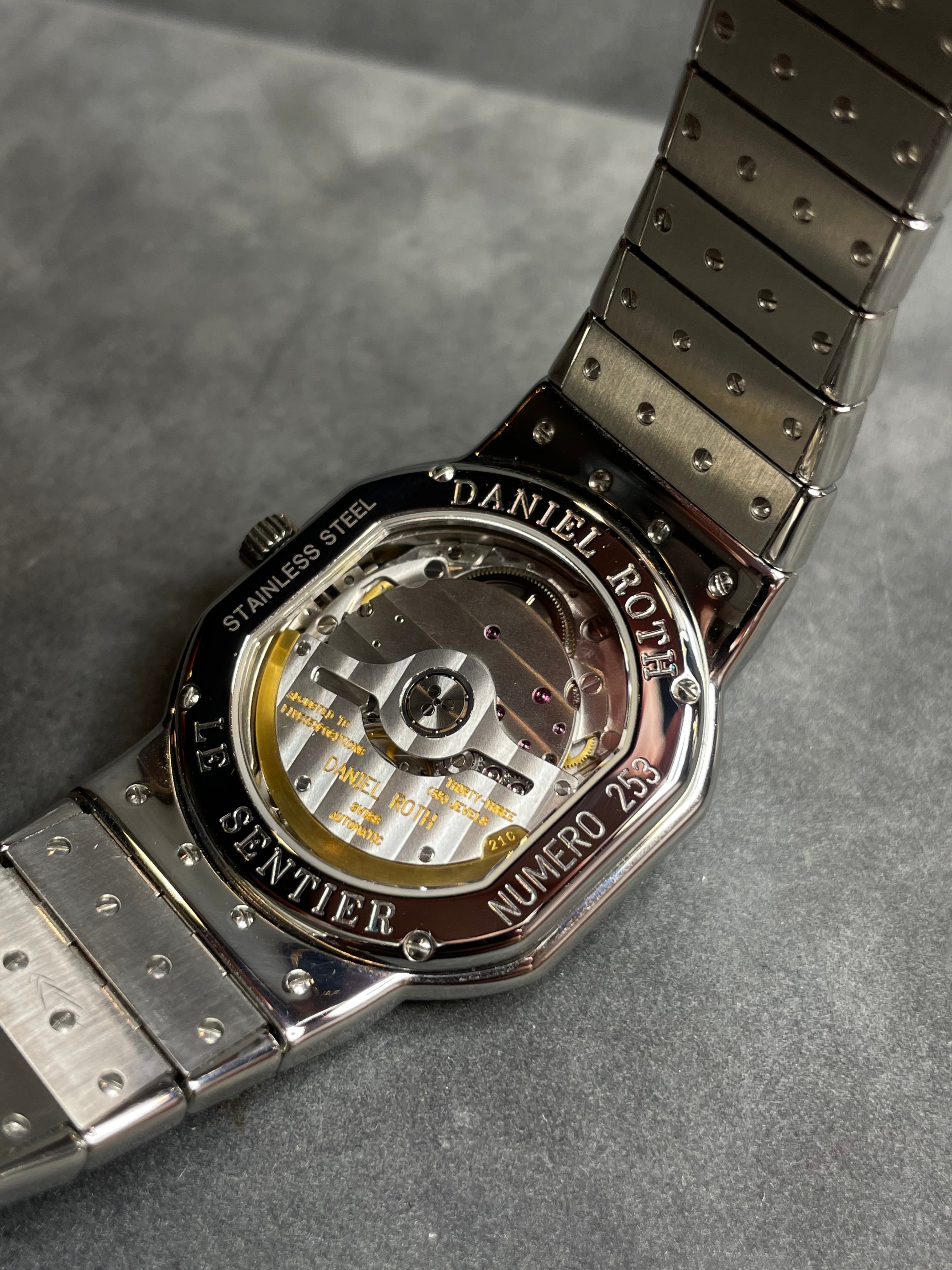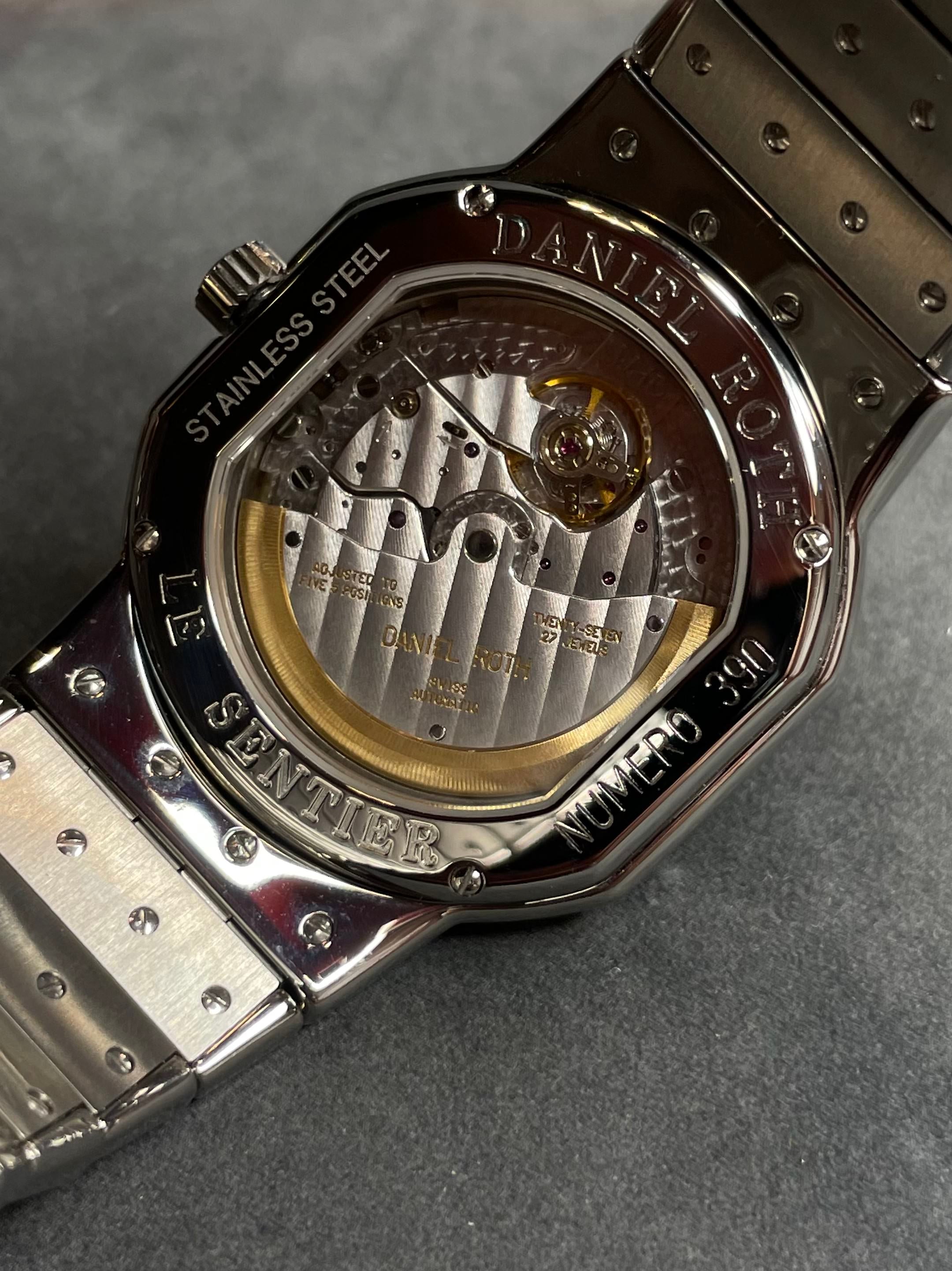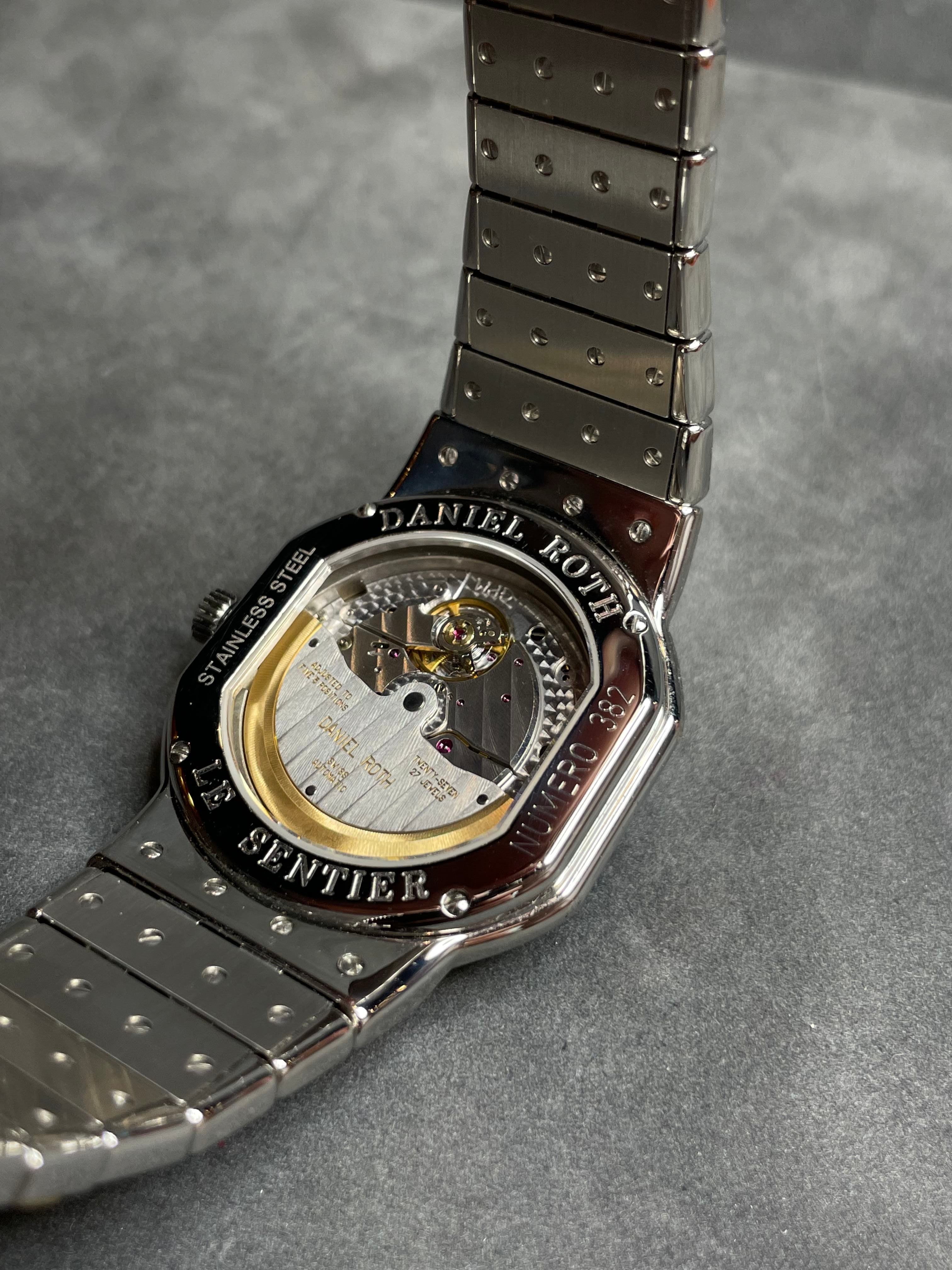 Der doppelte Ellipsenfall aus Stahl spiegelt die charakteristische Aussage von Daniel Roth am Handgelenk wider. Mit einer einzigartigen Form – die weder rund noch rechteckig ist, aber die beiden fein ausbalanciert – hat das Uhrwerk eine traditionelle Größe von 35 mm x 35 mm, die ebenso kühn wie angenehm zu tragen ist, mit einem schlanken Profil von 7,8 mm Dicke.