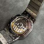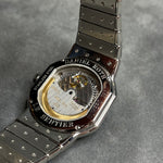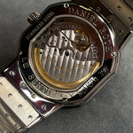 Dieses kultige Zeitmessgerät zeichnet sich durch eine hohe Verarbeitungsqualität aus, die das charakteristische Streifen-Guilloché-Muster aufweist. Das handgravierte, silberne Zifferblatt ist visuell beeindruckend und dennoch sehr gut lesbar dank der eleganten Farbkontraste, der auf einem gebürsteten Kapitelring platzierten römischen Ziffern und den blauen, pfeilförmigen Zeigern mit einem schleichenden Sekundenzeiger in Ankerform.