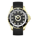 Dutch Master 3-Hand Solid Double Plated Gelbgold aerodynamisches Gehäuse mit nicht reflektierendem, mit Saphir beschichtetem Glas und einem Silikon-Schnellverschlussarmband. Diese Uhr verfügt über eine robuste Schraubkrone, um eine Wasserdichtigkeit von 10 ATM (entspricht 100 m unter dem Meeresspiegel) zu gewährleisten.