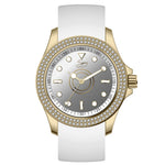 "Dutch Master 3-Hand Armbanduhr mit solidem, gelbvergoldetem aerodynamischen Gehäuse, nicht reflektierendem, mit Saphir beschichtetem Glas und einem Silikon-Schnellwechselarmband. Diese Uhr verfügt über eine robuste Schraubkrone, die eine Wasserdichtigkeit von 10 ATM (entspricht 100 m unter dem Meeresspiegel) gewährleistet."