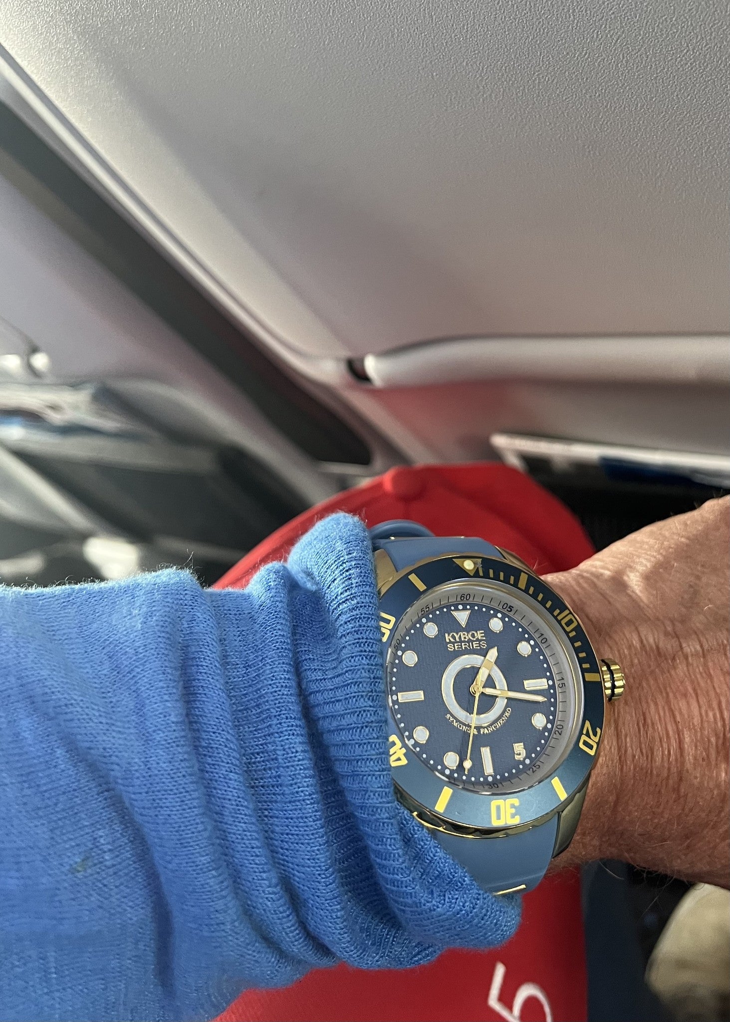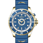 Kyboe Giant Series 3-Hand mit solidem, doppelt vergoldetem, aerodynamischem Gehäuse (blaues Ziffernblatt, blaue Lünette) mit nicht reflektierendem, mit Saphir beschichtetem Glas und einem Silikonarmband. Diese Uhr verfügt über eine robuste, verschraubte Krone, um eine Wasserdichtigkeit von 10 ATM zu gewährleisten (entspricht einer Leistung von 100 m unter dem Meeresspiegel).