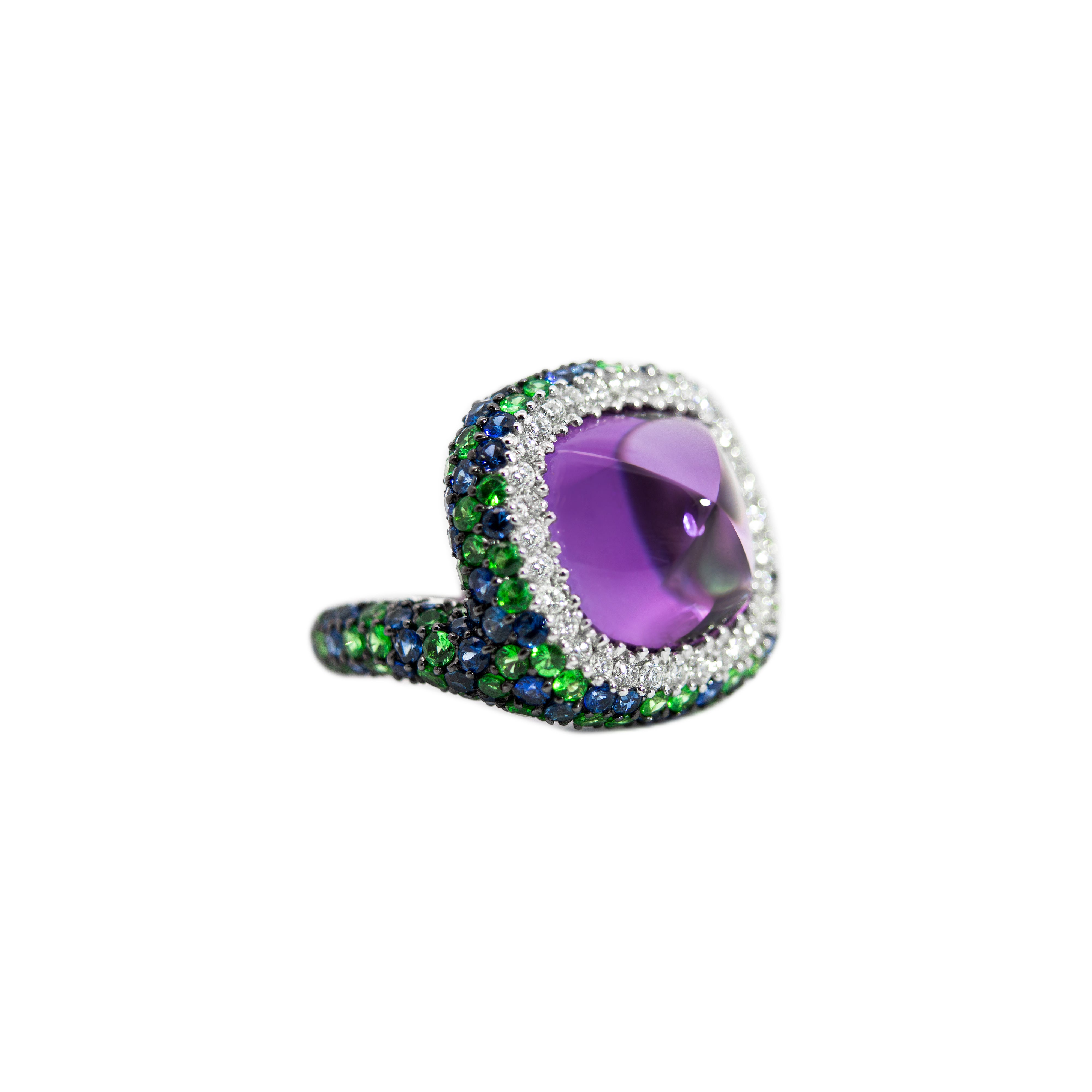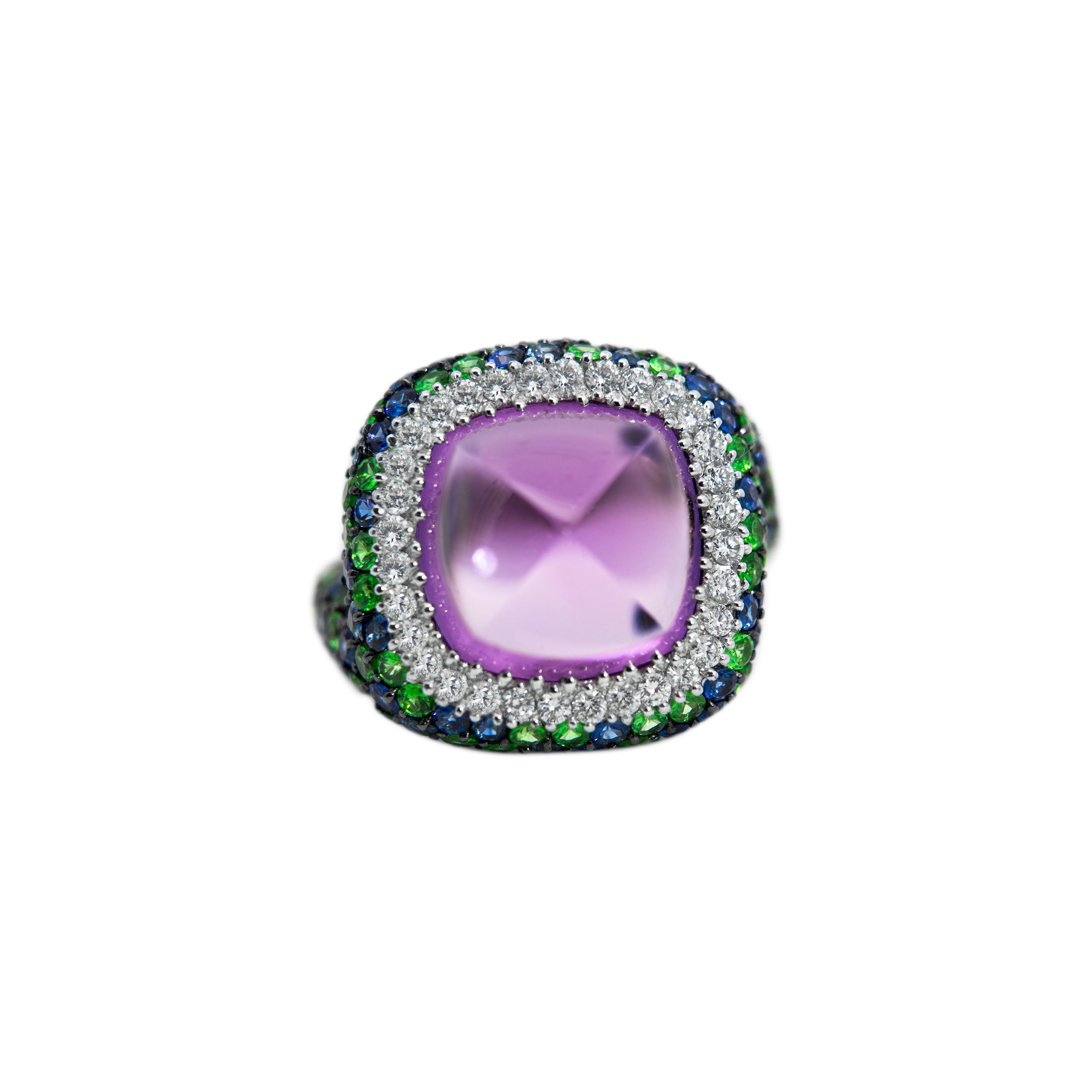 Ring mit großen Amethyst-Diamanten, Saphiren und Tsavoriten