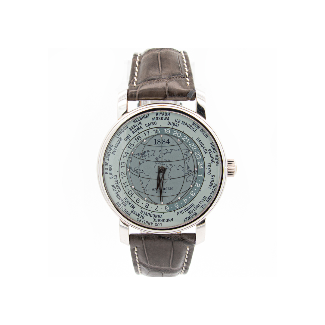 Dial: World Time Dial featuring multiple cities in blue with a center map engraving