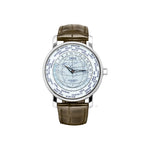 Dial: World Time Dial featuring multiple cities in blue with a center map engraving