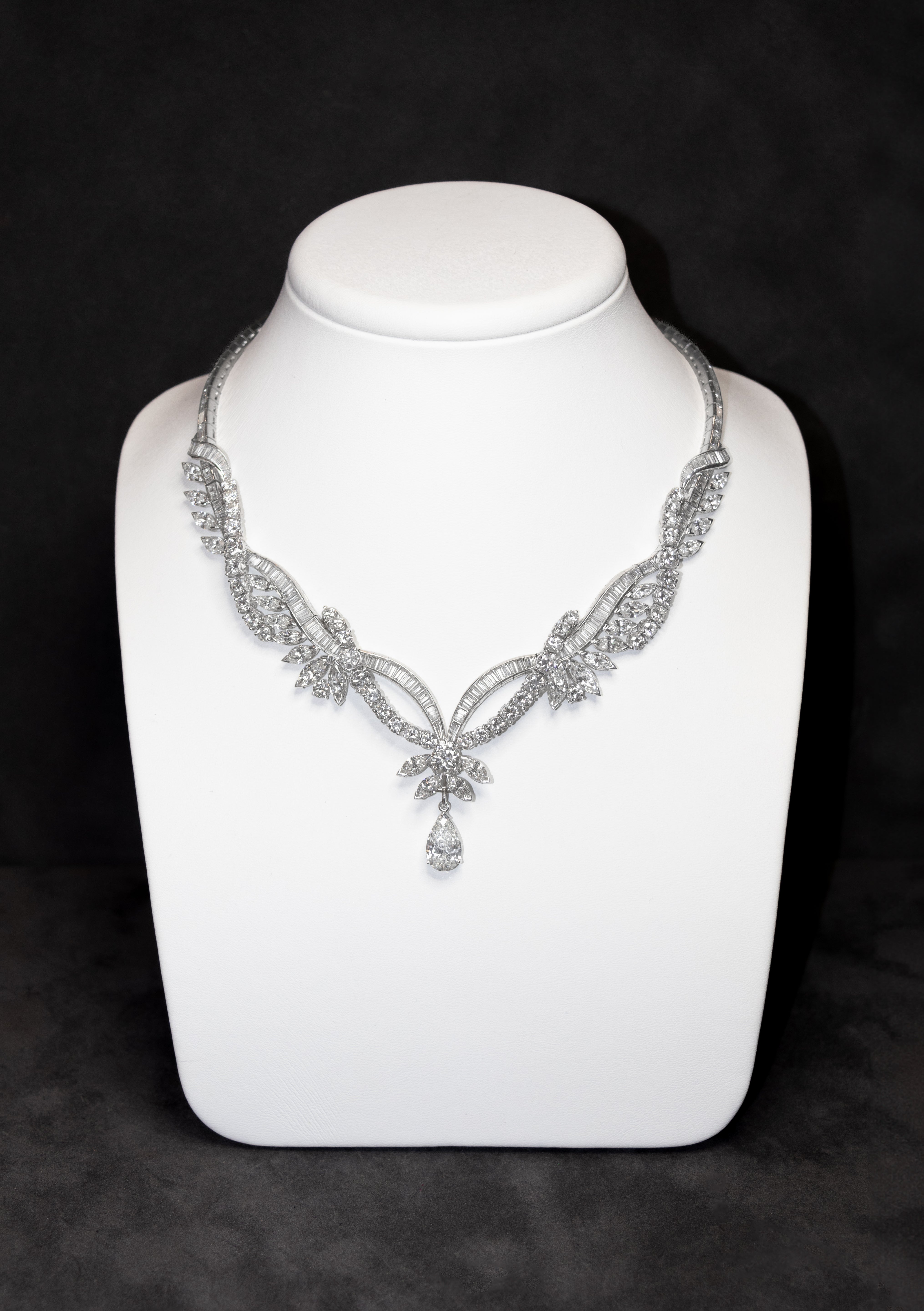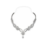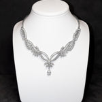 This stunning antique necklace showcases exquisite craftsmanship, blending vintage elegance with timeless sophistication. The design features an intricate arrangement of sparkling diamonds, set in a graceful pattern that flows along the neckline. At the center, a teardrop-shaped diamond pendant adds a touch of classic luxury, enhancing the necklace's overall allure. The piece is meticulously designed with delicate, leaf-like motifs that give it a regal appearance, perfect for formal occasions or adding a statement to any ensemble. Its radiant brilliance and refined structure make it a true masterpiece of antique jewelry design.