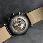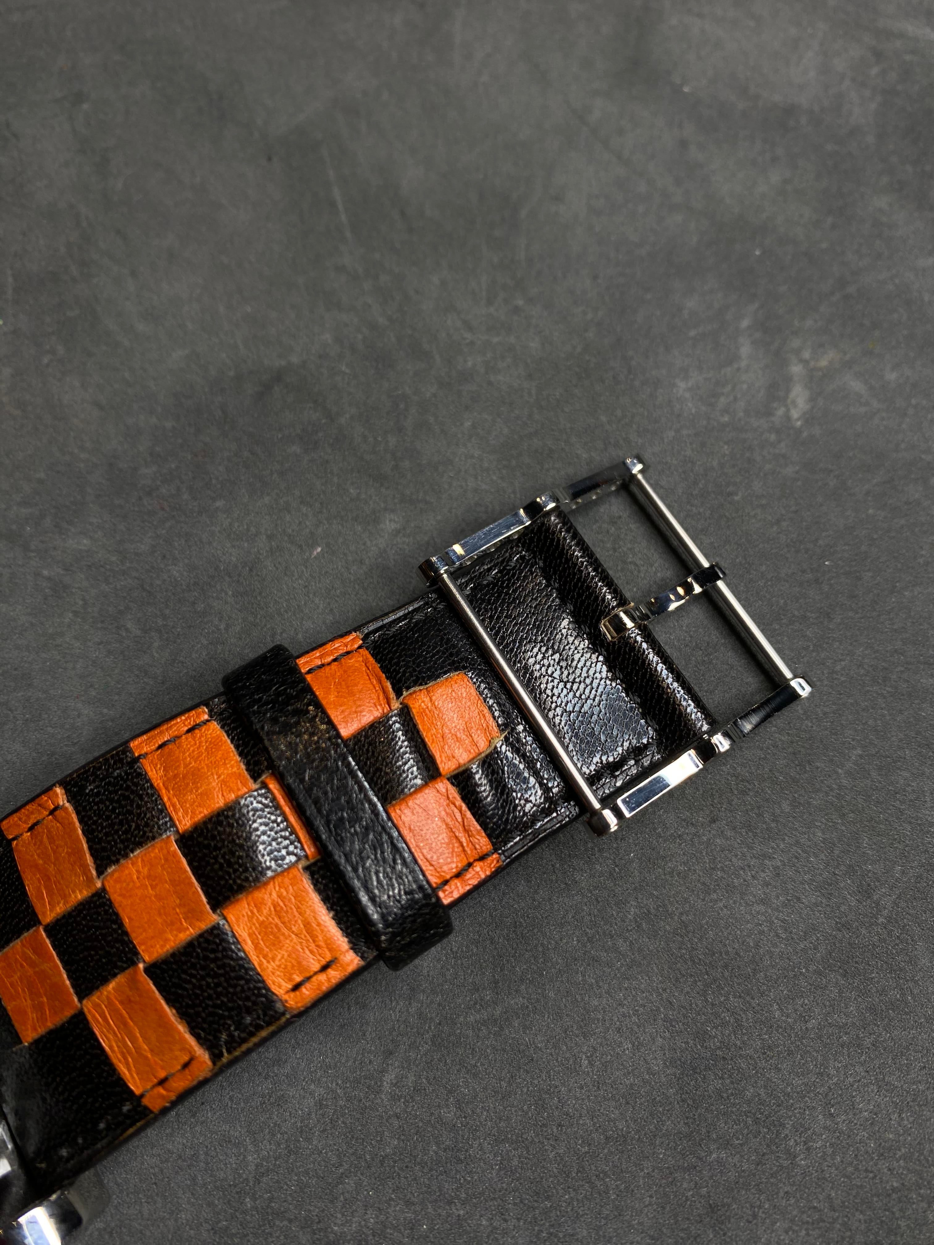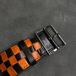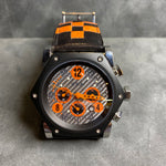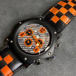 Strap: Black leather strap with orange stitching and detailing, complementing the dial design