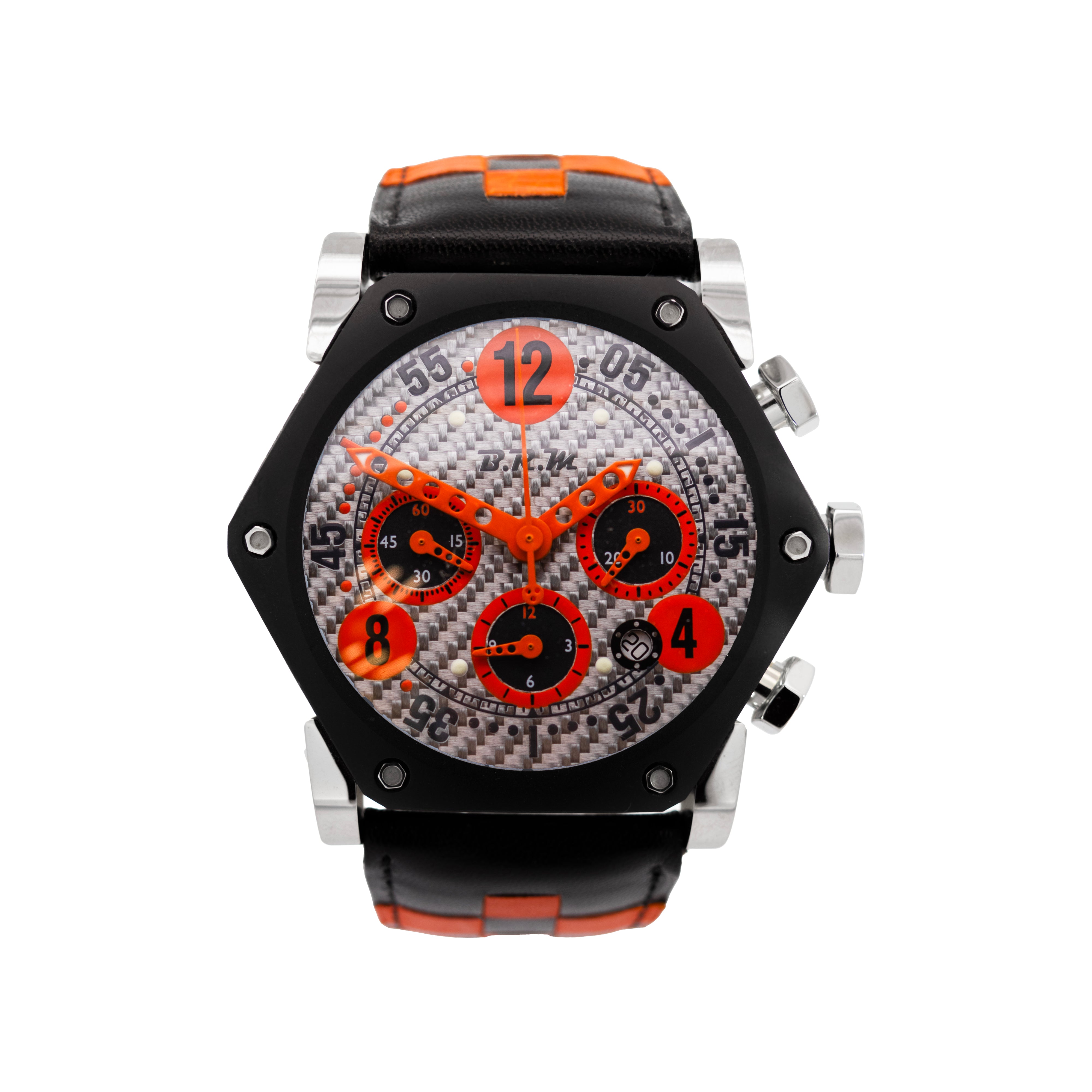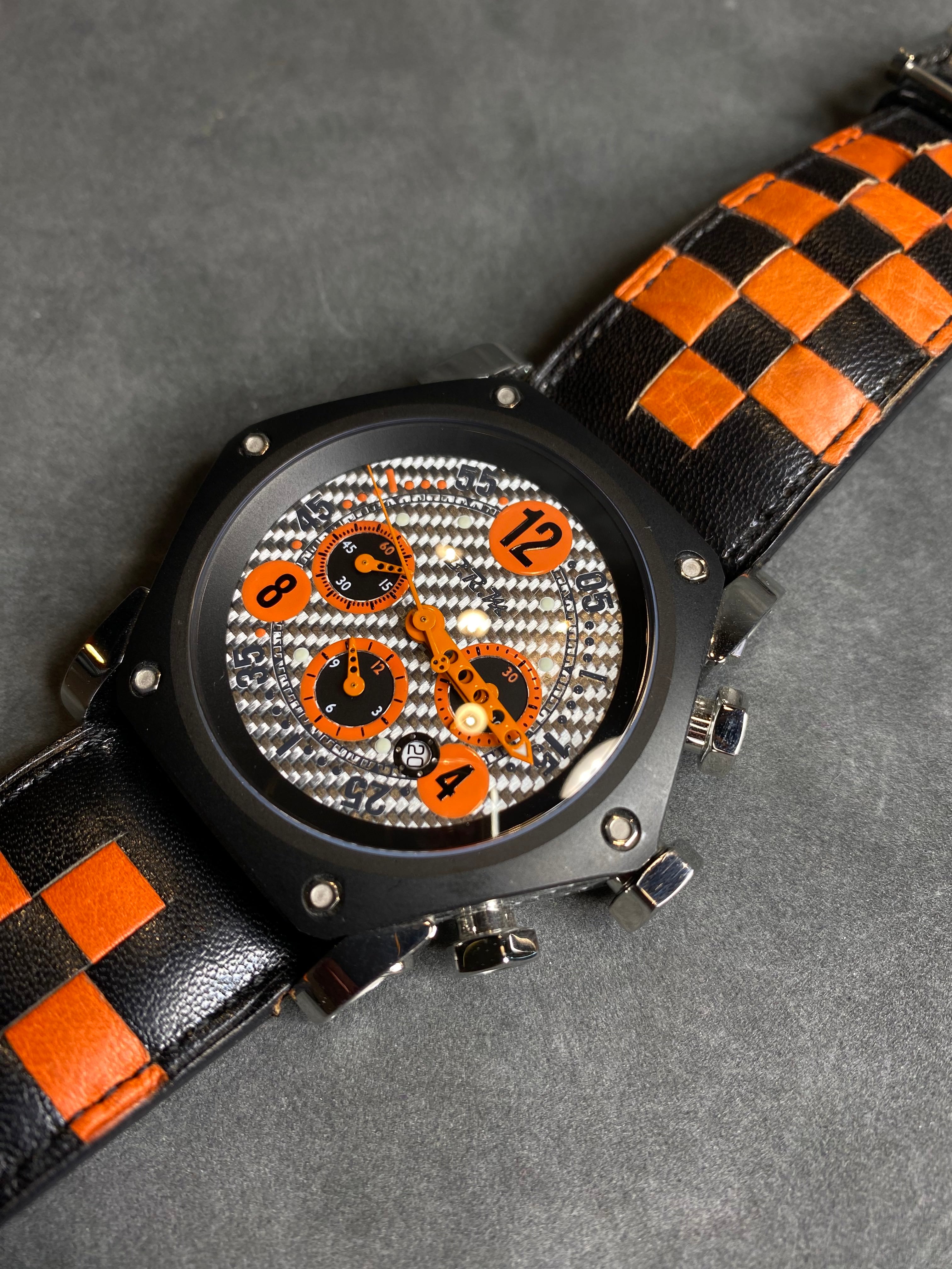 Distinctive Dial: Silver carbon fiber dial with contrasting orange accents on numerals, subdials, and hands