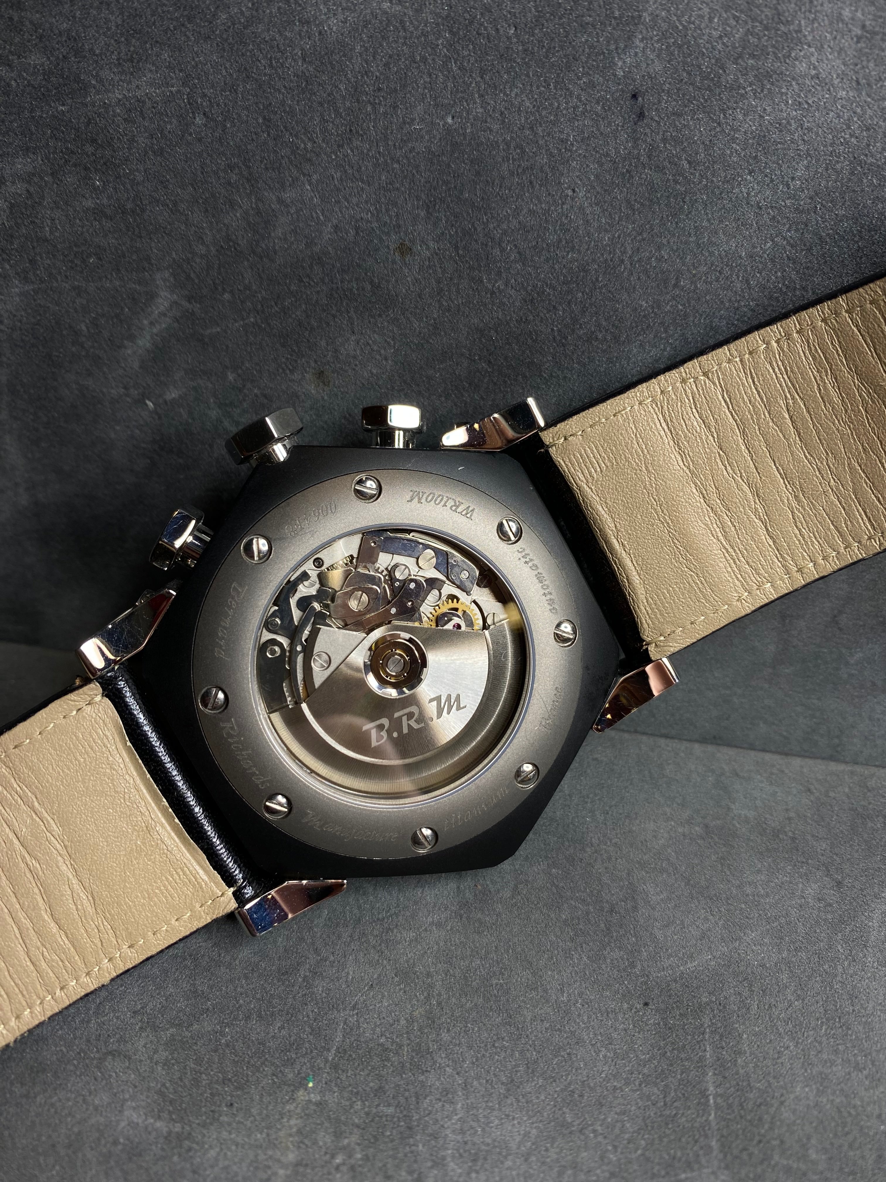 This sporty and distinctive B.R.M SCR 48 FV FVO AO timepiece combines bold aesthetics with high-end craftsmanship, ideal for watch enthusiasts seeking a standout chronograph. Its lightweight titanium case and precise automatic movement make it both functional and visually striking.