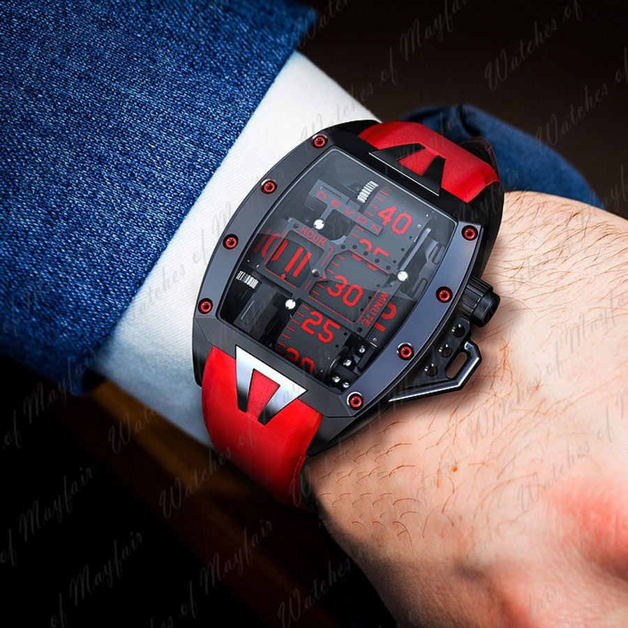 The Devon Tread 2 Redrum is a bold collector’s piece, ideal for enthusiasts of avant-garde luxury watches and high-technology timepieces.