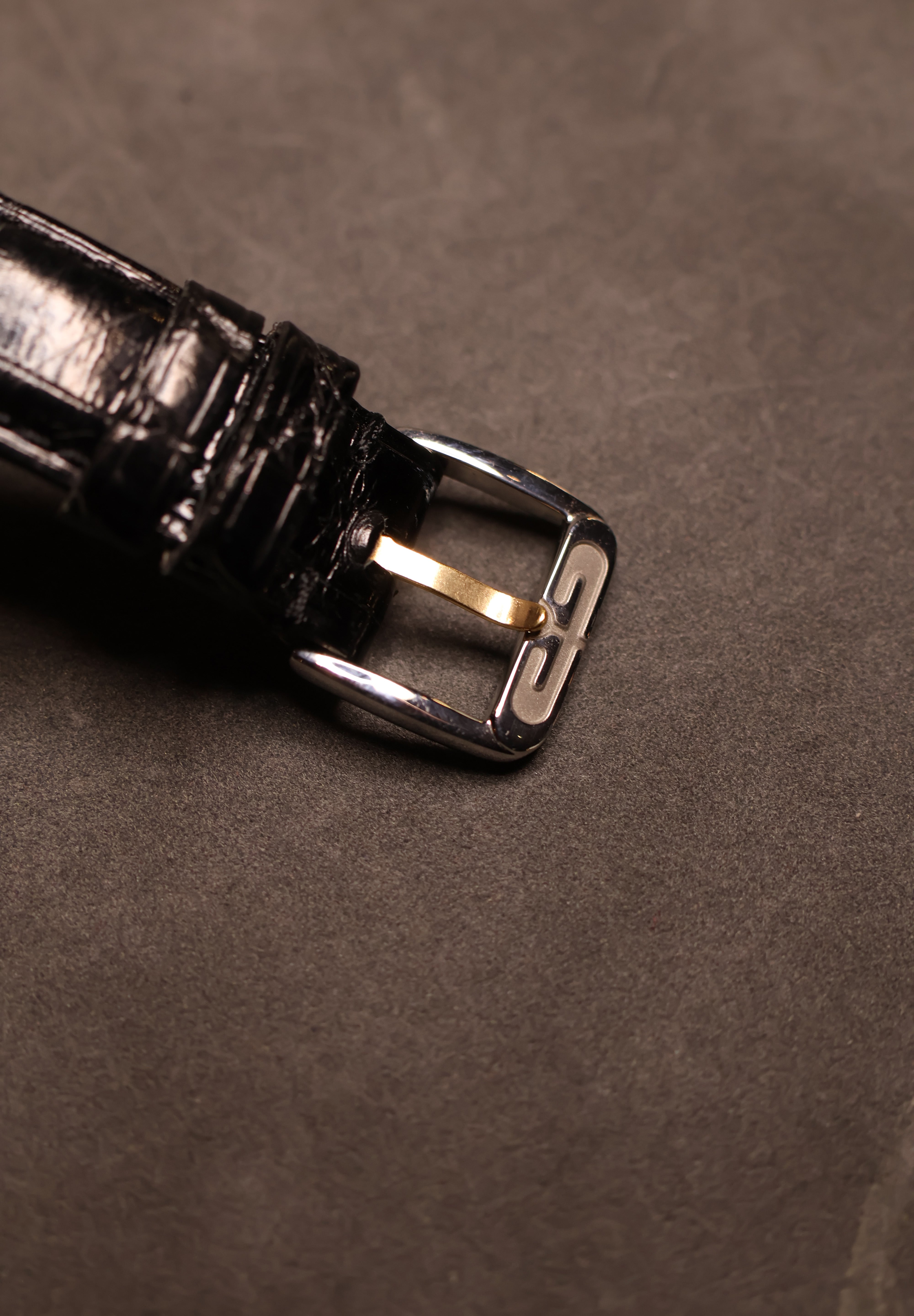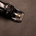 - Bracelet: Black crocodile leather strap with a secure buckle