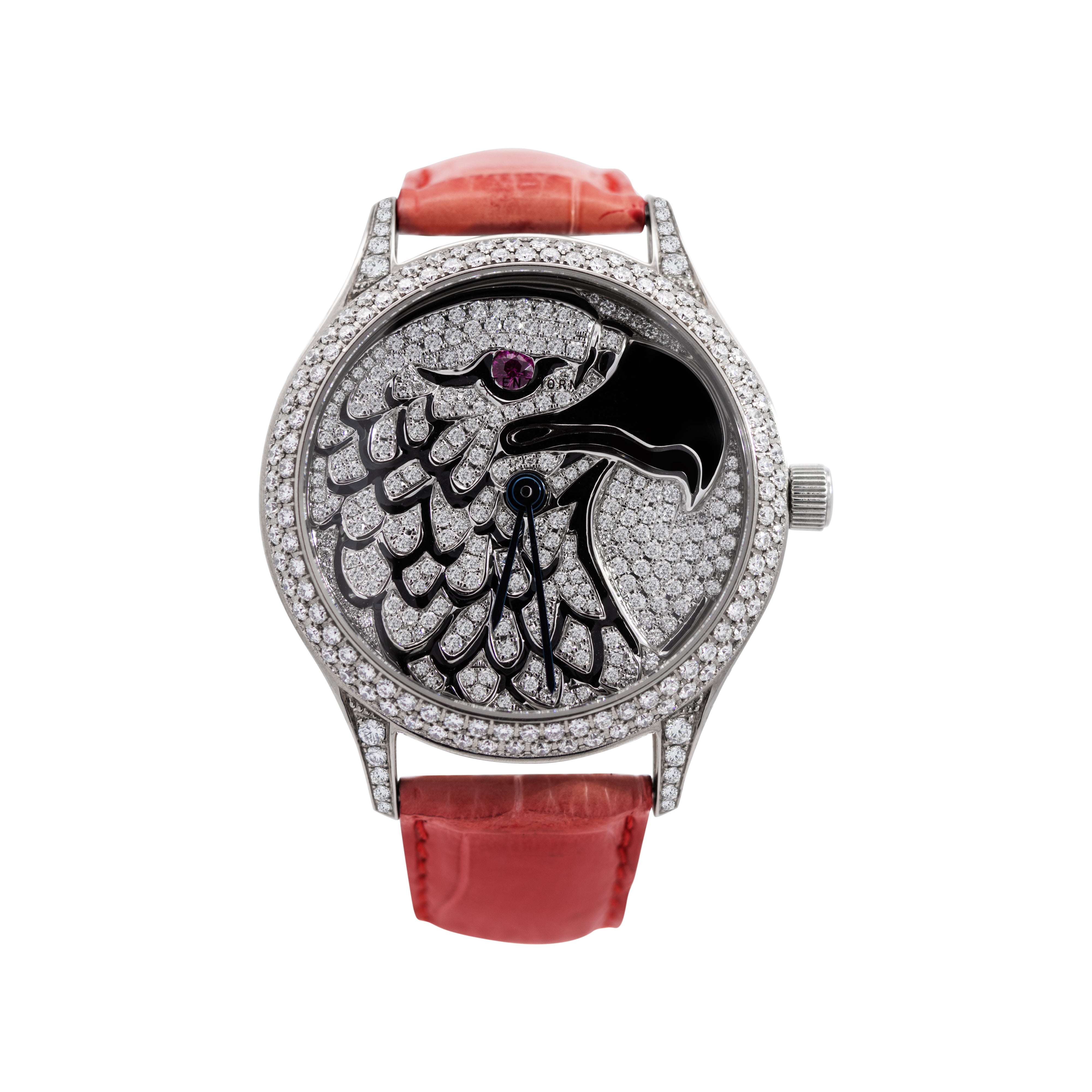- Dial: Diamond-encrusted eagle motif (7,41 ct FC/VS) with black enamel detailing and ruby-set eye (0,15 ct)
