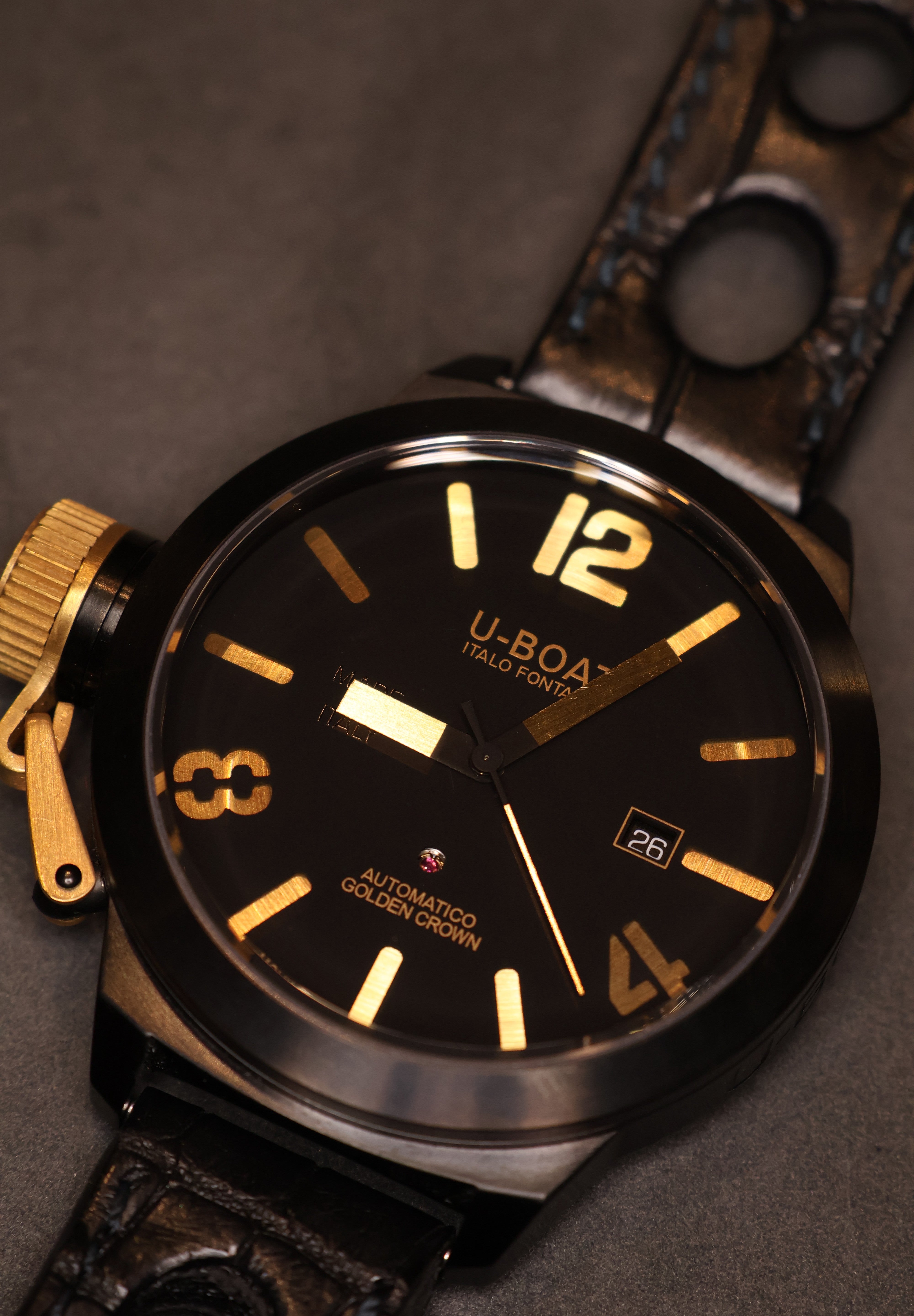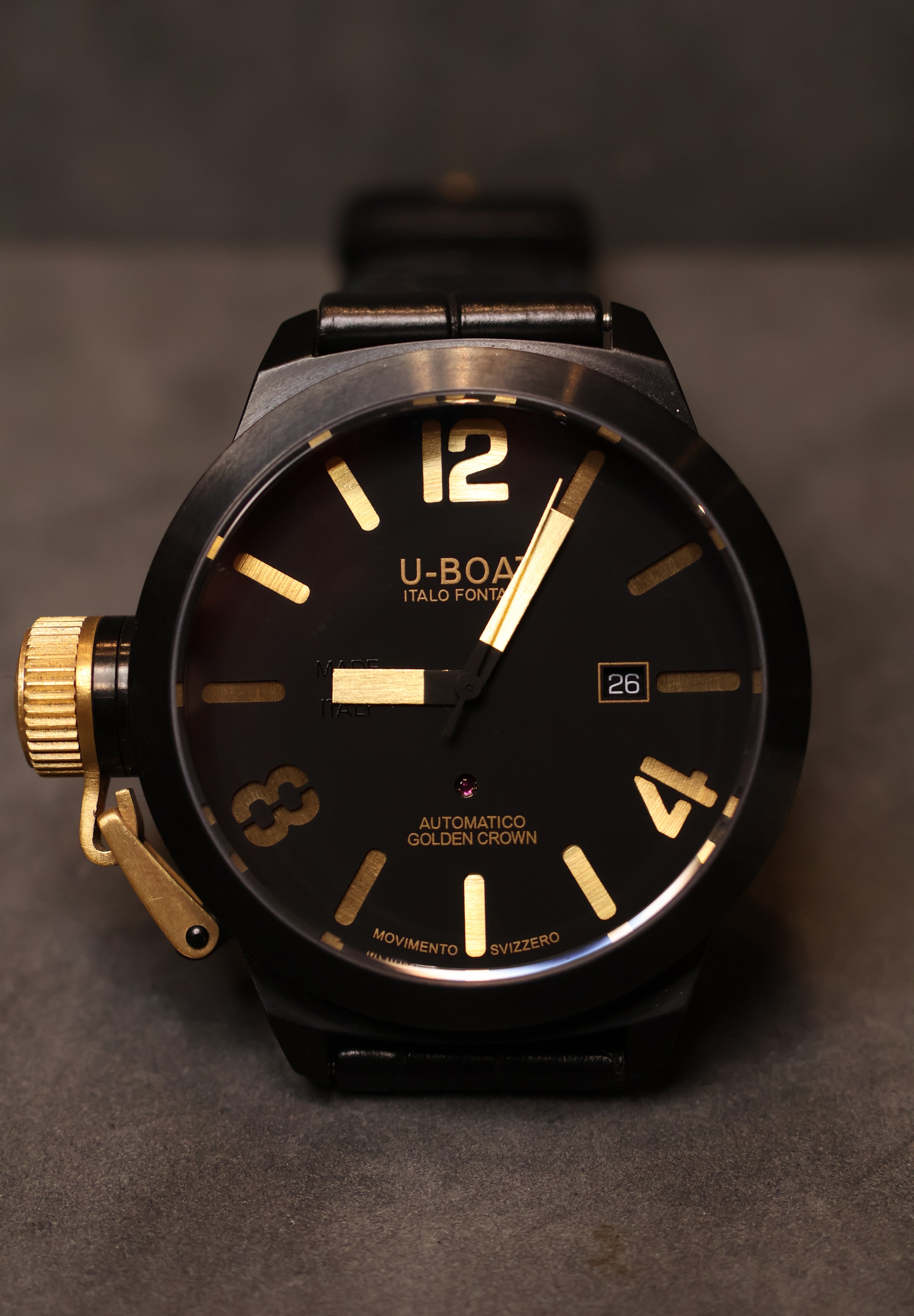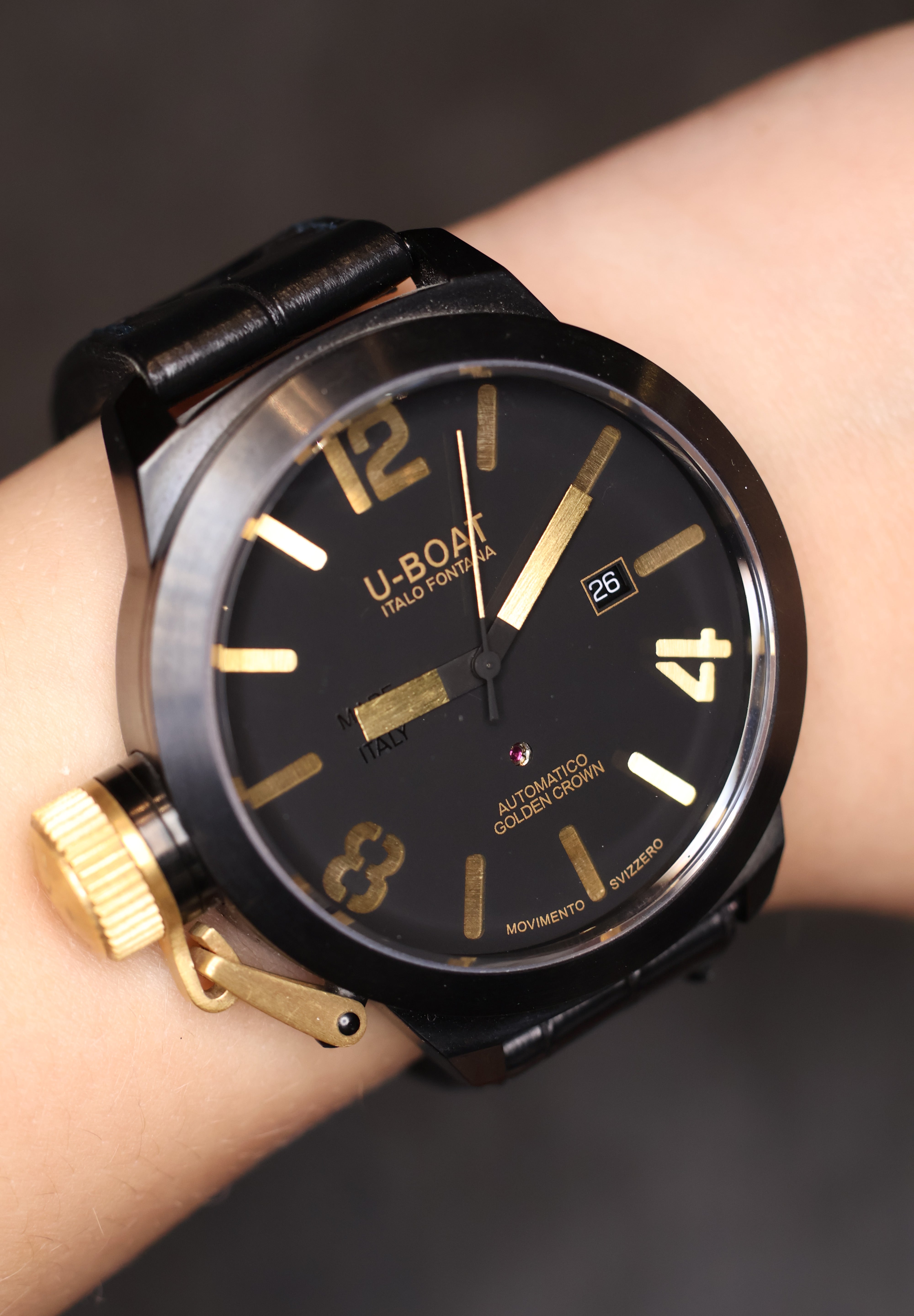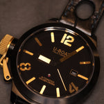 Dial Numbers: Large Arabic numerals (12, 3, and 9), golden accents