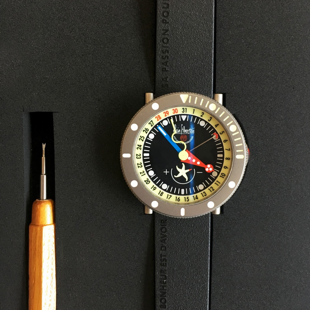 Дисплей: Хронограф с красочными геометрическими стрелками и дополнительными циферблатами