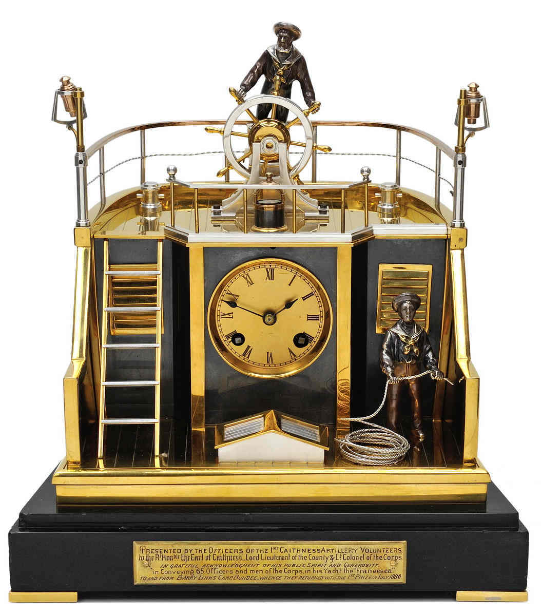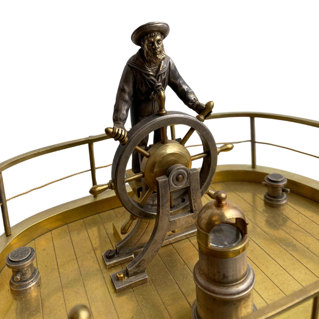 Этот замечательный антикварный французский автоматонные часы, часть престижной серии Industrial, спроектированы так, чтобы напоминать корабельную четверть палубы. Бронзовый и посеребренный корпус тщательно имитирует палубу, включая функциональный компас с бинаклем и четвертьмастера у штурвала. По обе стороны от четвертьмастера расположены искусно выполненные лампы с трехцветной отделкой (бронза, медь и серебро), подвешенные на карданах для реалистичности.
