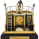 Вся эта сцена расположена на ступенчатом основании из черного мрамора с позолоченными бронзовыми ножками-кронштейнами. Часы оснащены французским механизмом с двумя заводами, маркированным GLT для Guilmet и номером 1653, который отбивает часы и половины на гонге. Штурман образует верхнюю часть составного маятника, покачиваясь взад и вперед с каждым тиком.