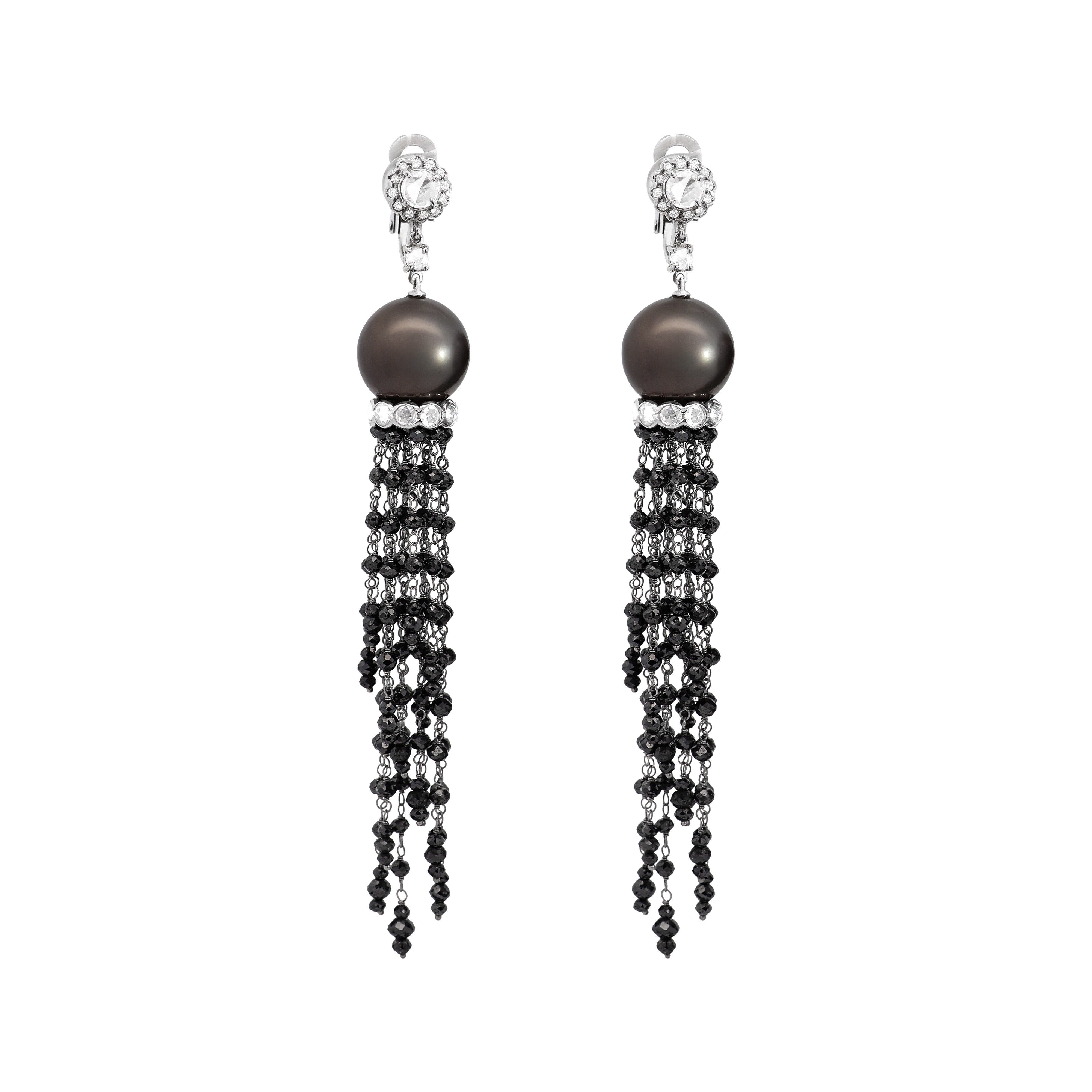 These exquisite Busatti drop earrings embody refined elegance and contemporary luxury. Crafted in 18K gold (11.32 g), the design combines luminous pearls, brilliant diamonds, and cascading black gemstone tassels, creating a striking and sophisticated silhouette.