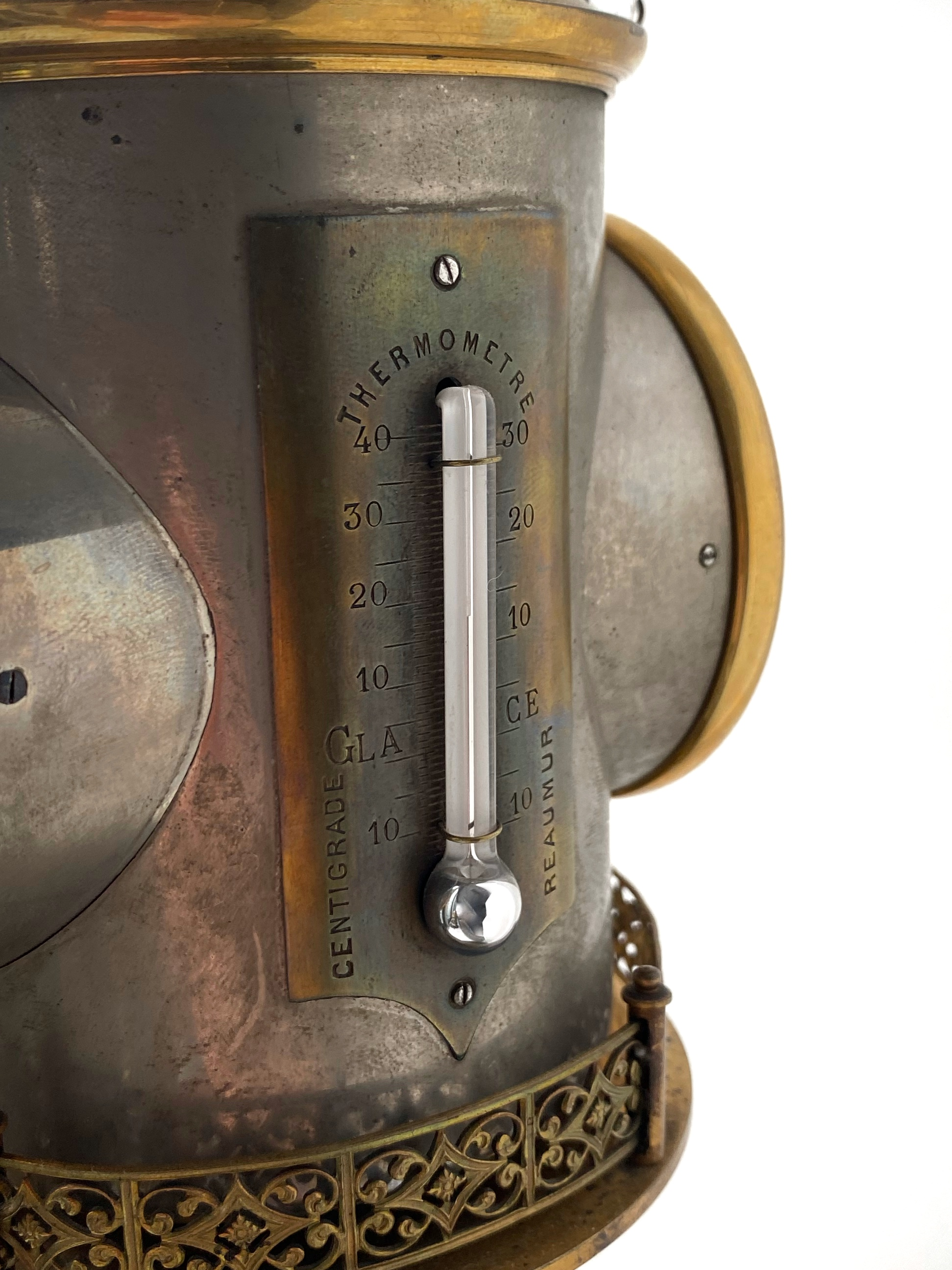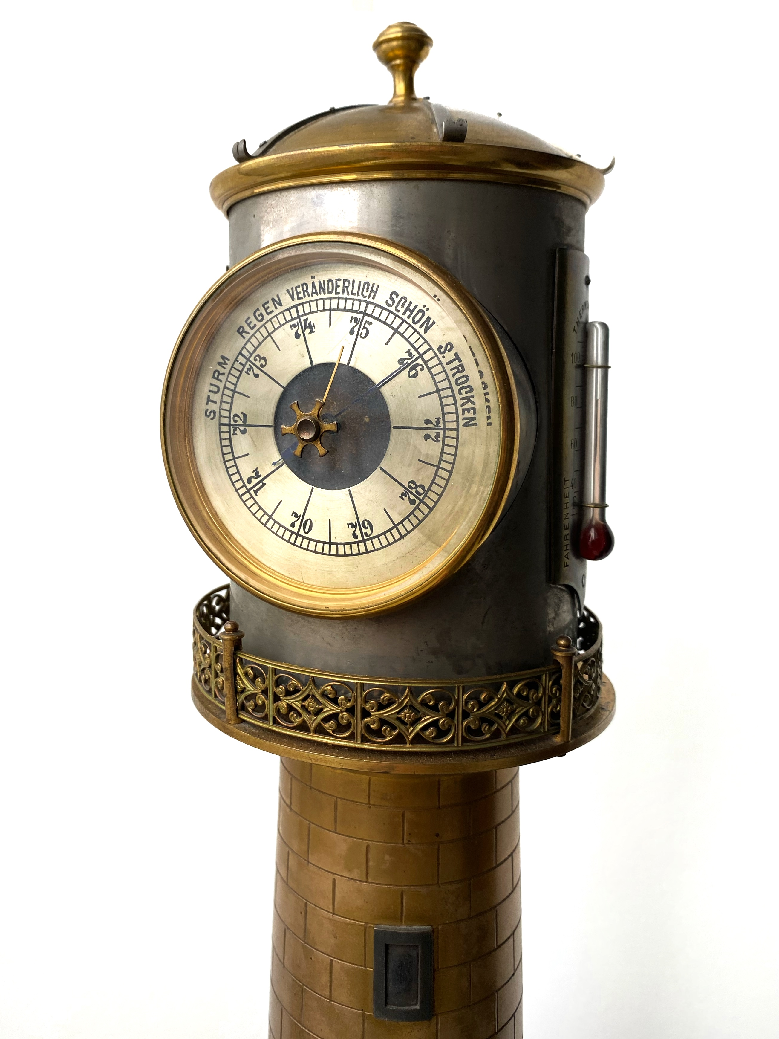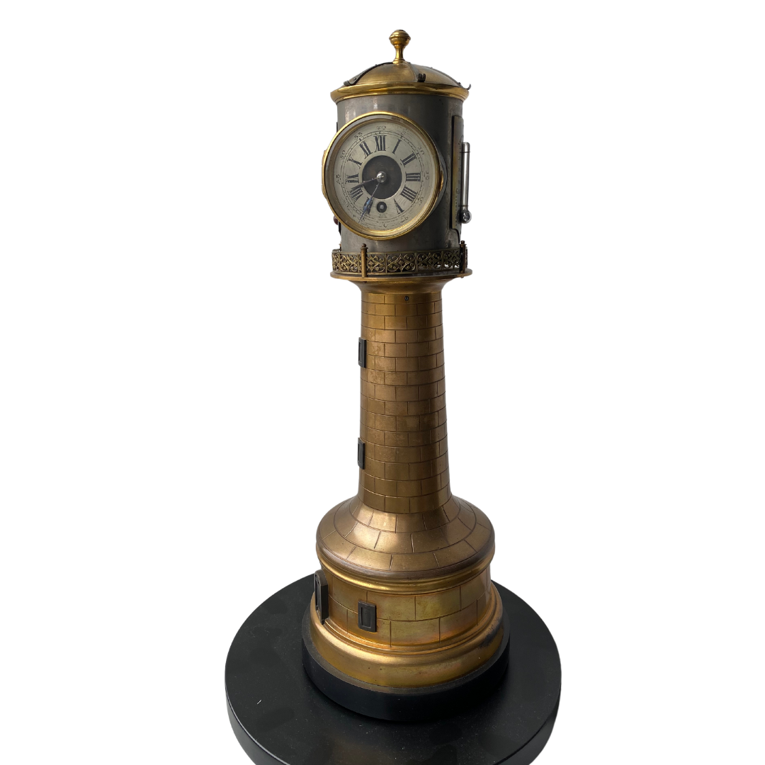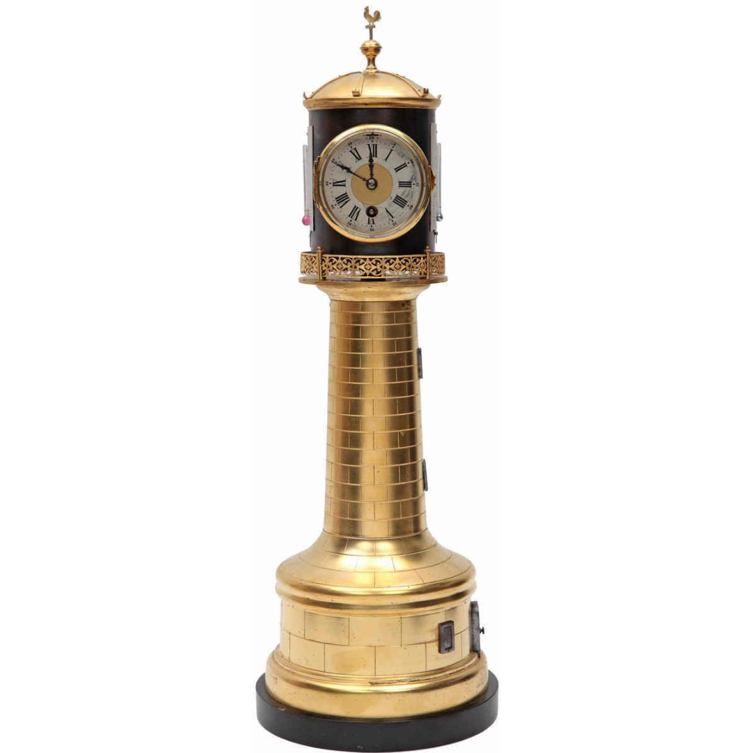 Созданные Андре Роменом Гильмэ в Париже около 1880 года, эти маячные часы являются потрясающим изделием из бронзы и меди с посеребренными элементами. Часы работают на восьмидневном механизме, расположенном в верхней части, напоминающей маяк, и оснащены барометром, расположенным напротив вращающейся верхней части. Вокруг каждого циферблата расположен термометр: один для Цельсия и один для Фаренгейта. Вращающийся механизм часов приводится в движение зубчатым валом и заводным механизмом, расположенными у основания.