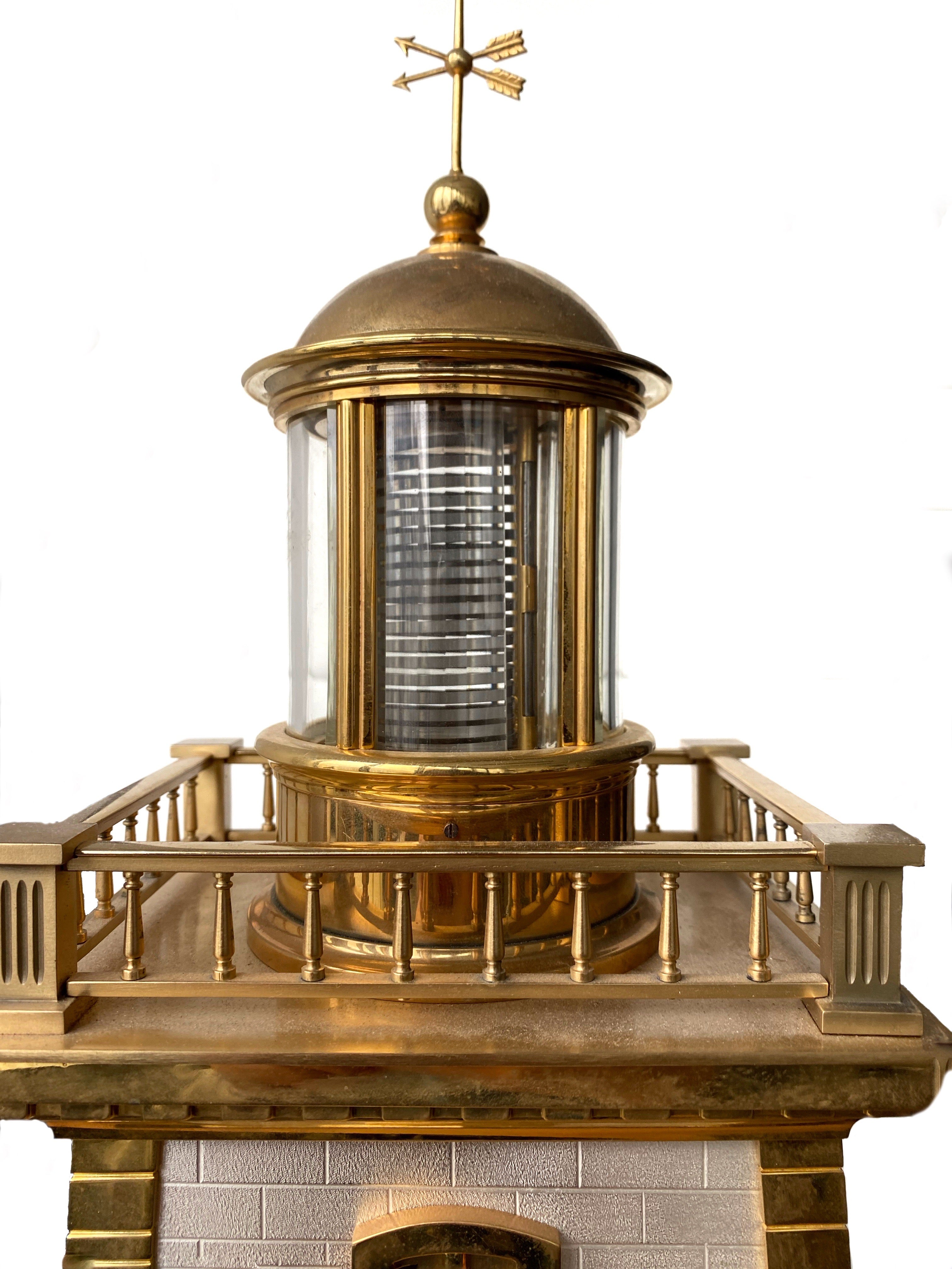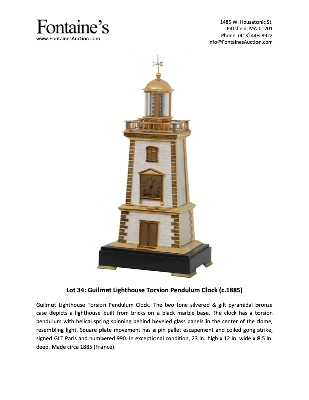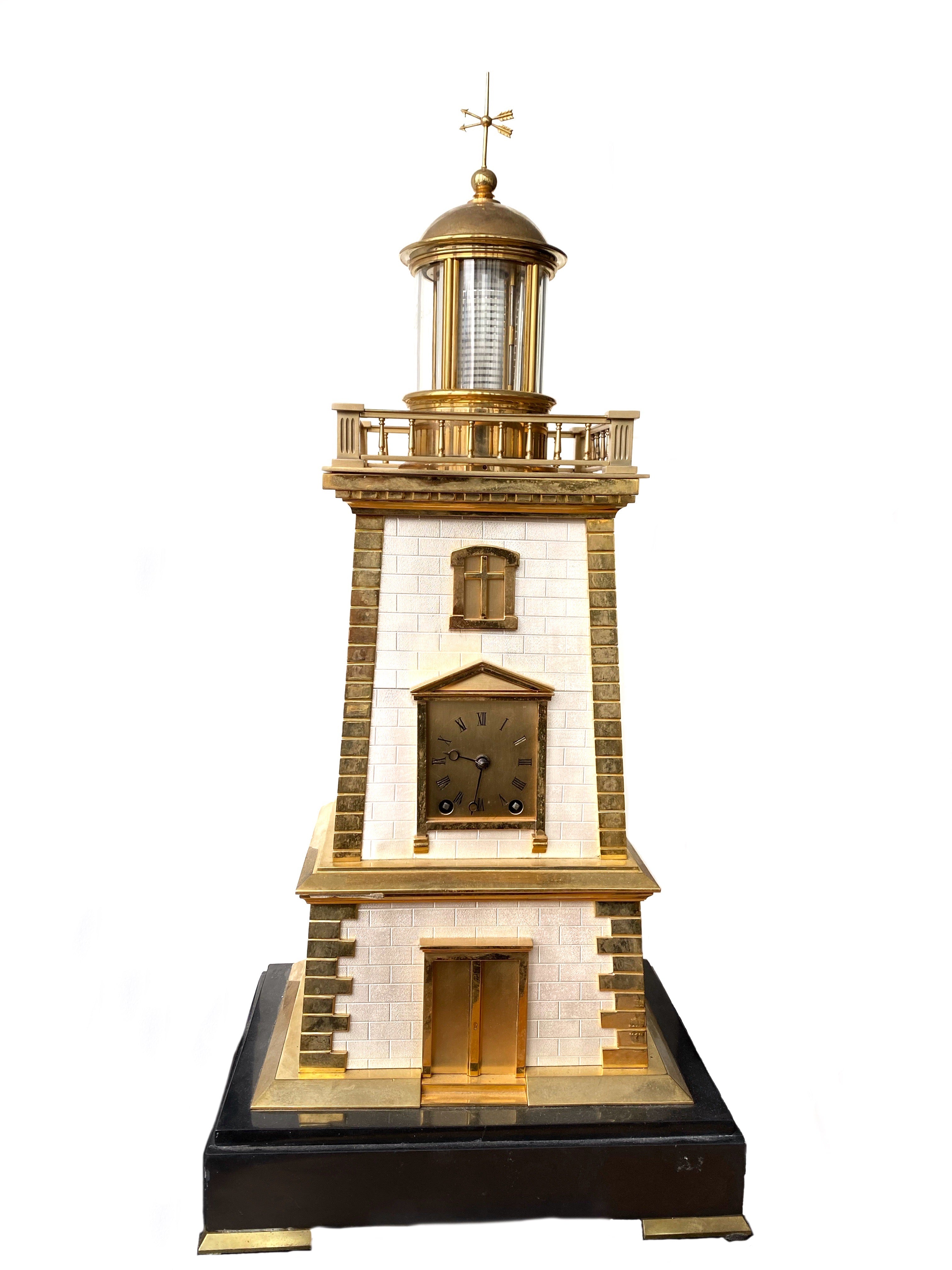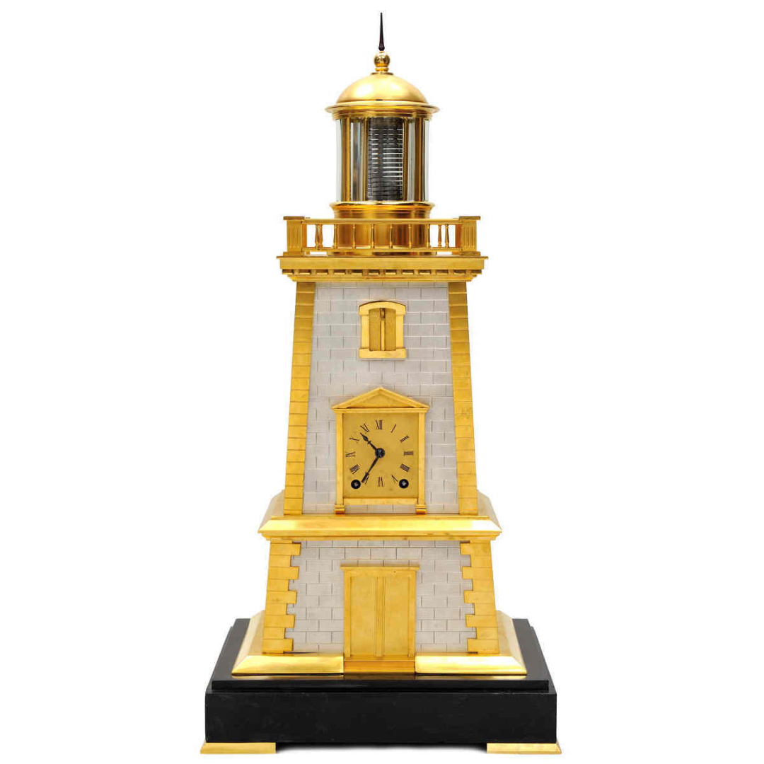 Часы с крутильным маятником маяка Гильмэ — выдающийся пример часовщицкого мастерства, сочетающий художественный дизайн с механической точностью. Этот изысканный хронометр заключён в двухцветный серебристо-золотистый пирамидальный бронзовый корпус, тщательно выполненный так, чтобы напоминать маяк, построенный из кирпичей. Маяк элегантно стоит на массивной чёрной мраморной основе, что усиливает его визуальную привлекательность и обеспечивает прочное основание.