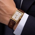 The watch is paired with a high-quality genuine leather strap (marked Switzerland), complementing the warm tones of gold and reinforcing its classic, sophisticated character.