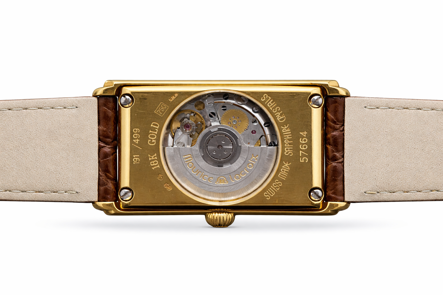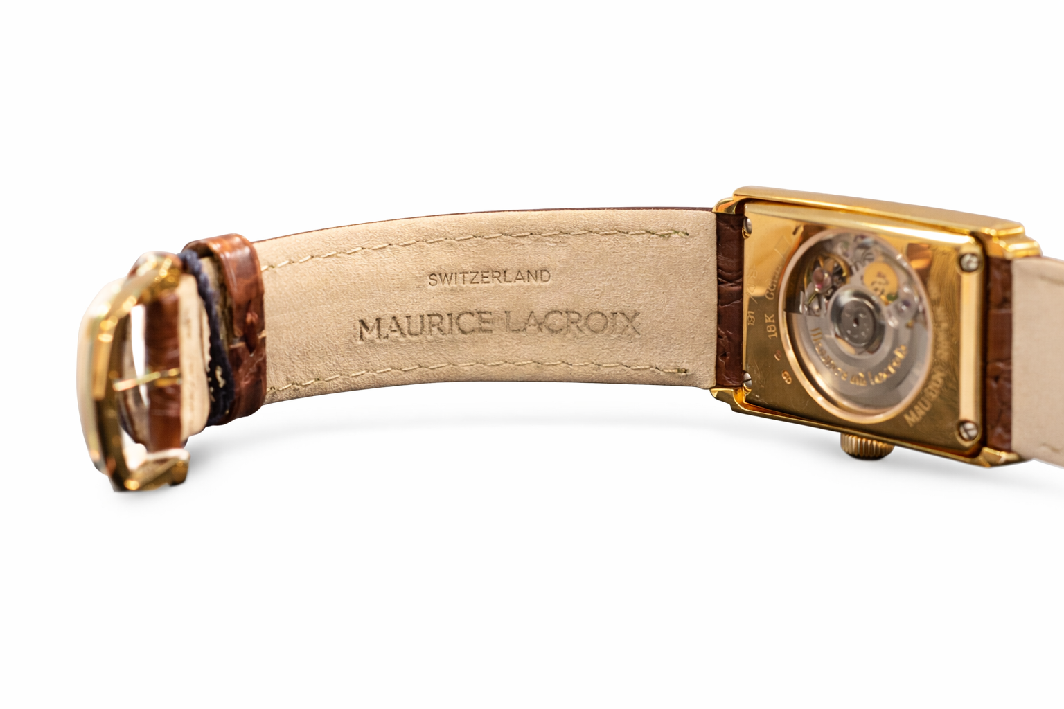Crafted in solid 18K gold, the rectangular case features a transparent sapphire crystal caseback, offering a captivating view of the finely engineered automatic movement. The oscillating rotor, engraved with the Maurice Lacroix signature, reflects the brand’s dedication to precision and detail.