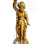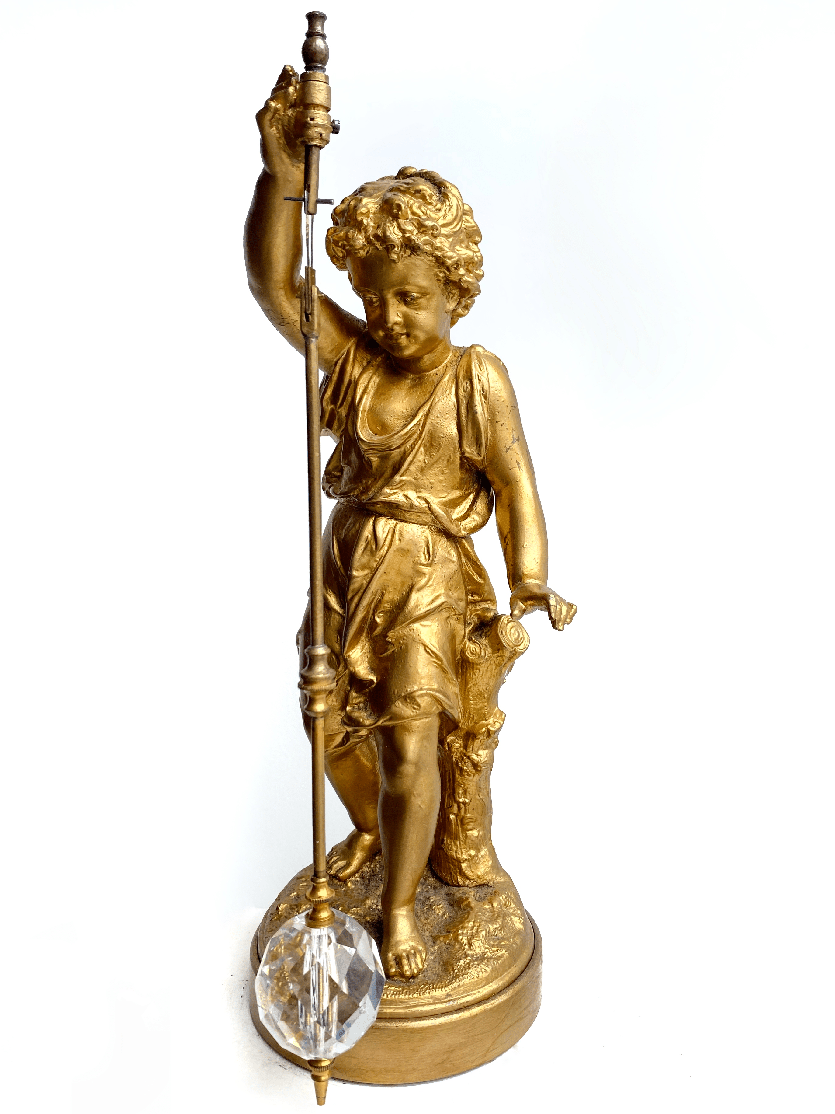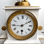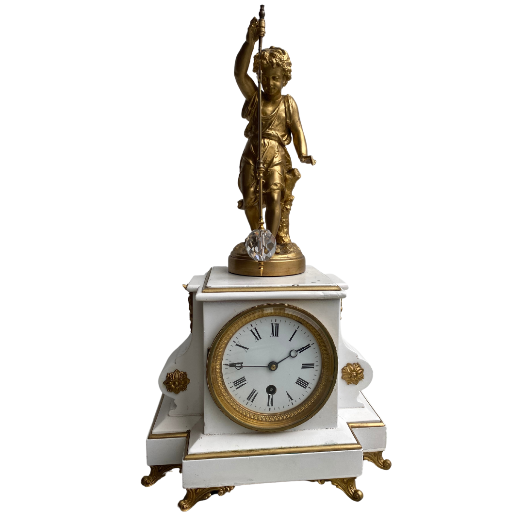 Часы на изображении, по-видимому, являются антикварными французскими каминными часами конца 19 века. Они украшены позолоченной бронзовой фигуркой ребенка с посохом, стоящего на основании из белого мрамора или камня с замысловатыми деталями и украшениями. Такие часы были популярны в конце 1800-х годов и часто называются «фигурными часами» из-за своих декоративных фигурок.