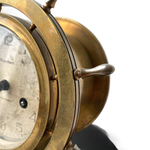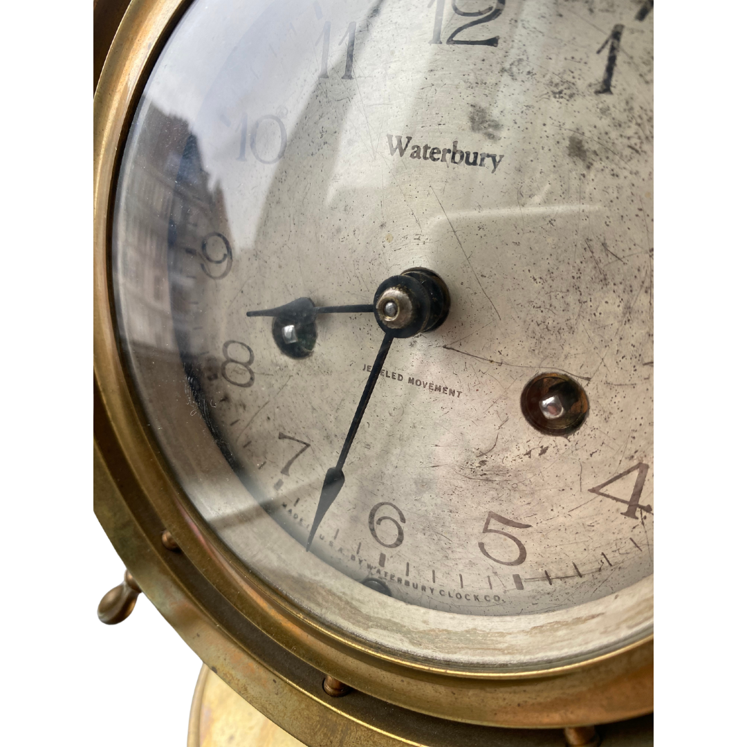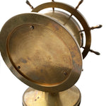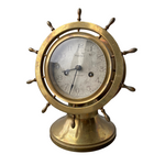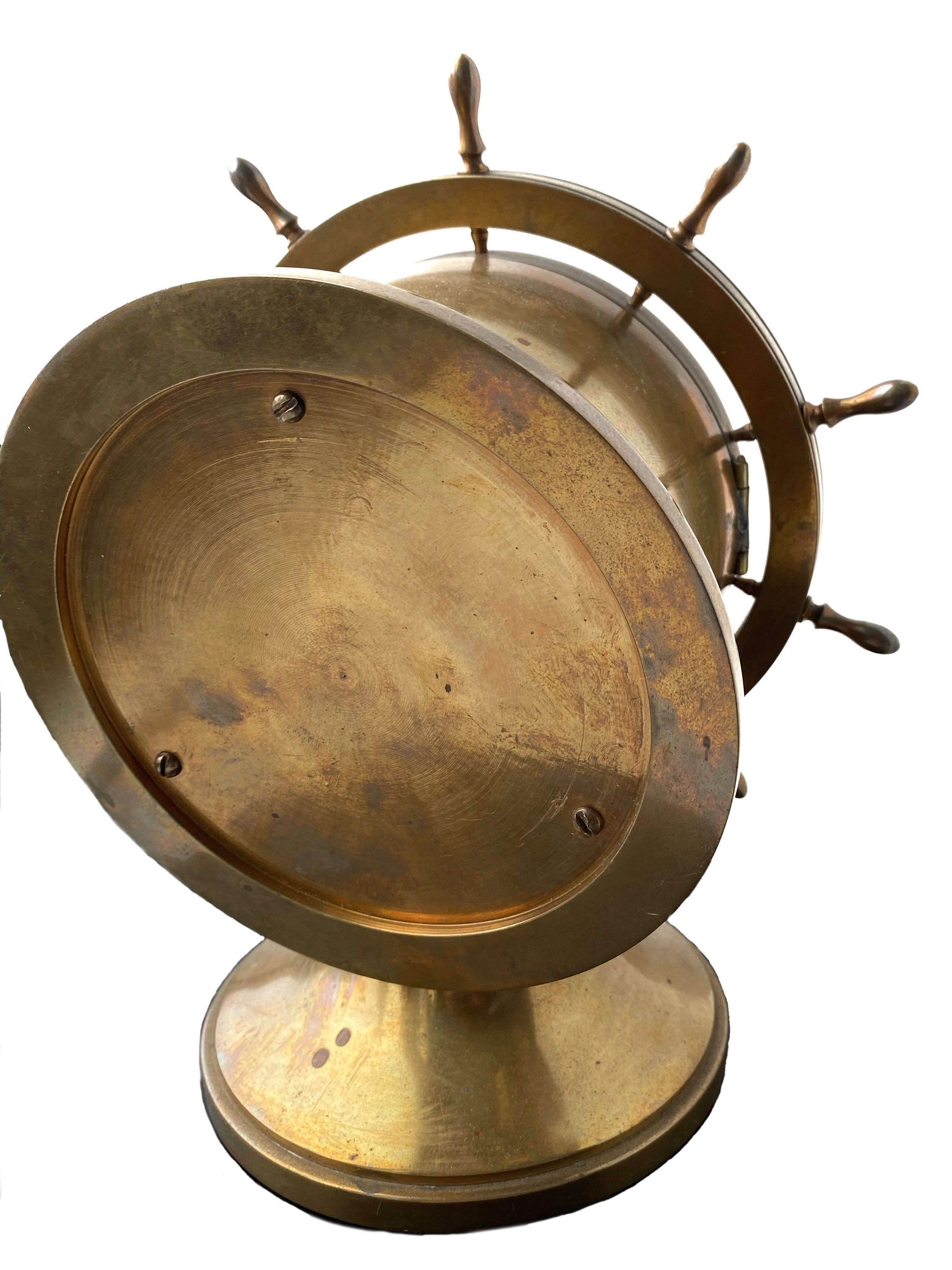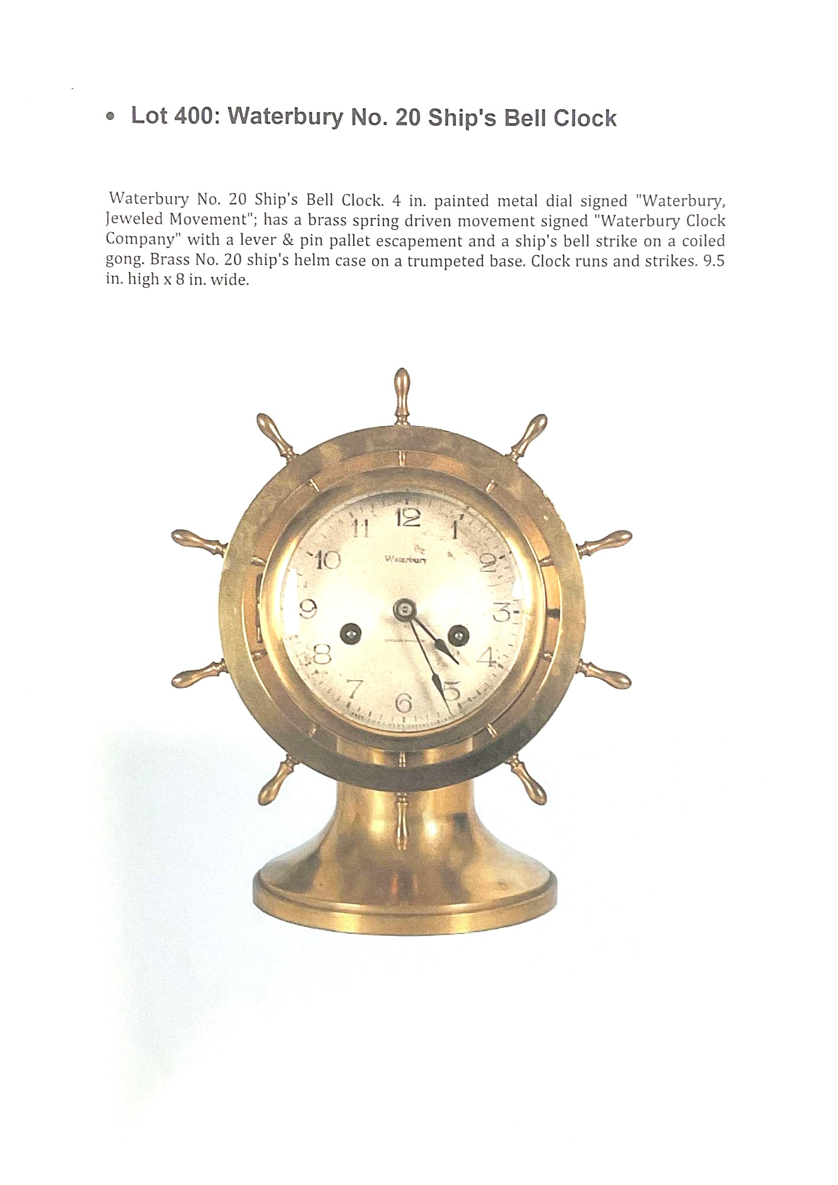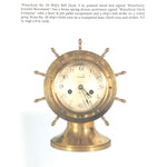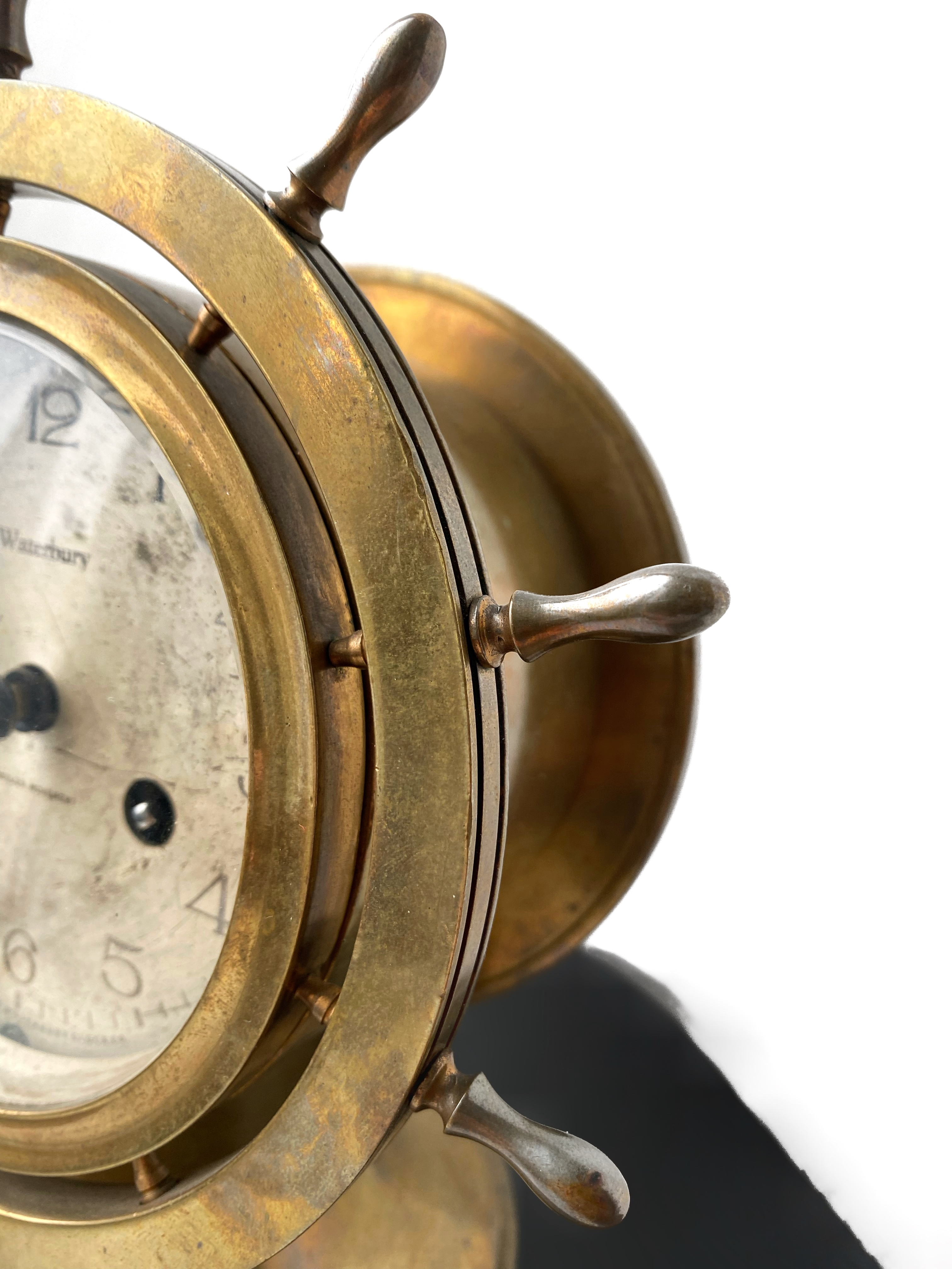 Часы с корабельным боем Waterbury No. 20. Циферблат из окрашенного металла диаметром 4 дюйма с подписью "Waterbury, Jeweled Movement"; механизм с пружинным приводом из латуни с подписью "Waterbury Clock Company", с рычажным и штифтовым анкерным ходом и боем корабельного колокола на спиральном гонге. Корпус в виде штурвала корабля No. 20 из латуни на подставке с расширяющимся основанием. Часы работают и отбивают время. Высота 9,5 дюйма, ширина 8 дюймов.