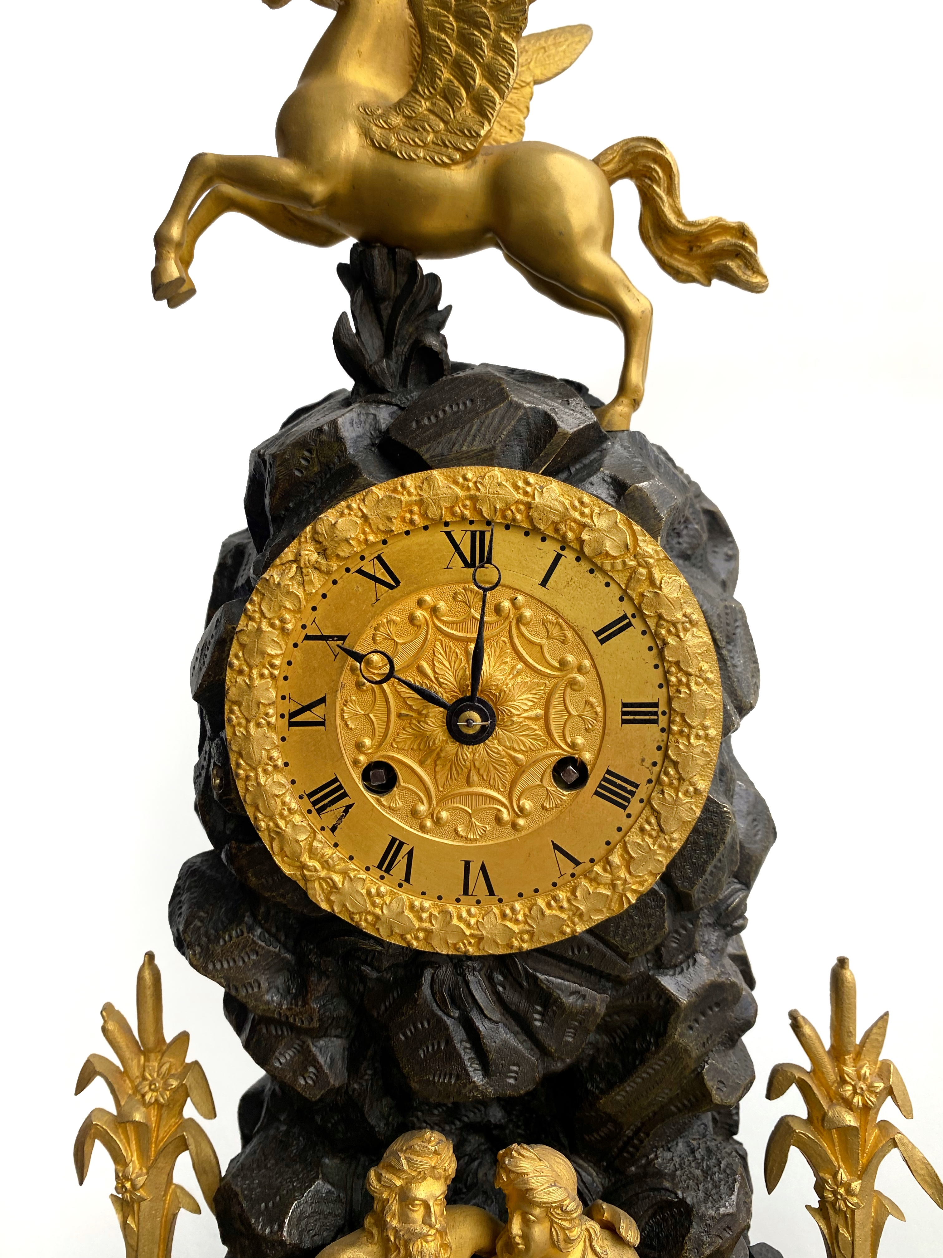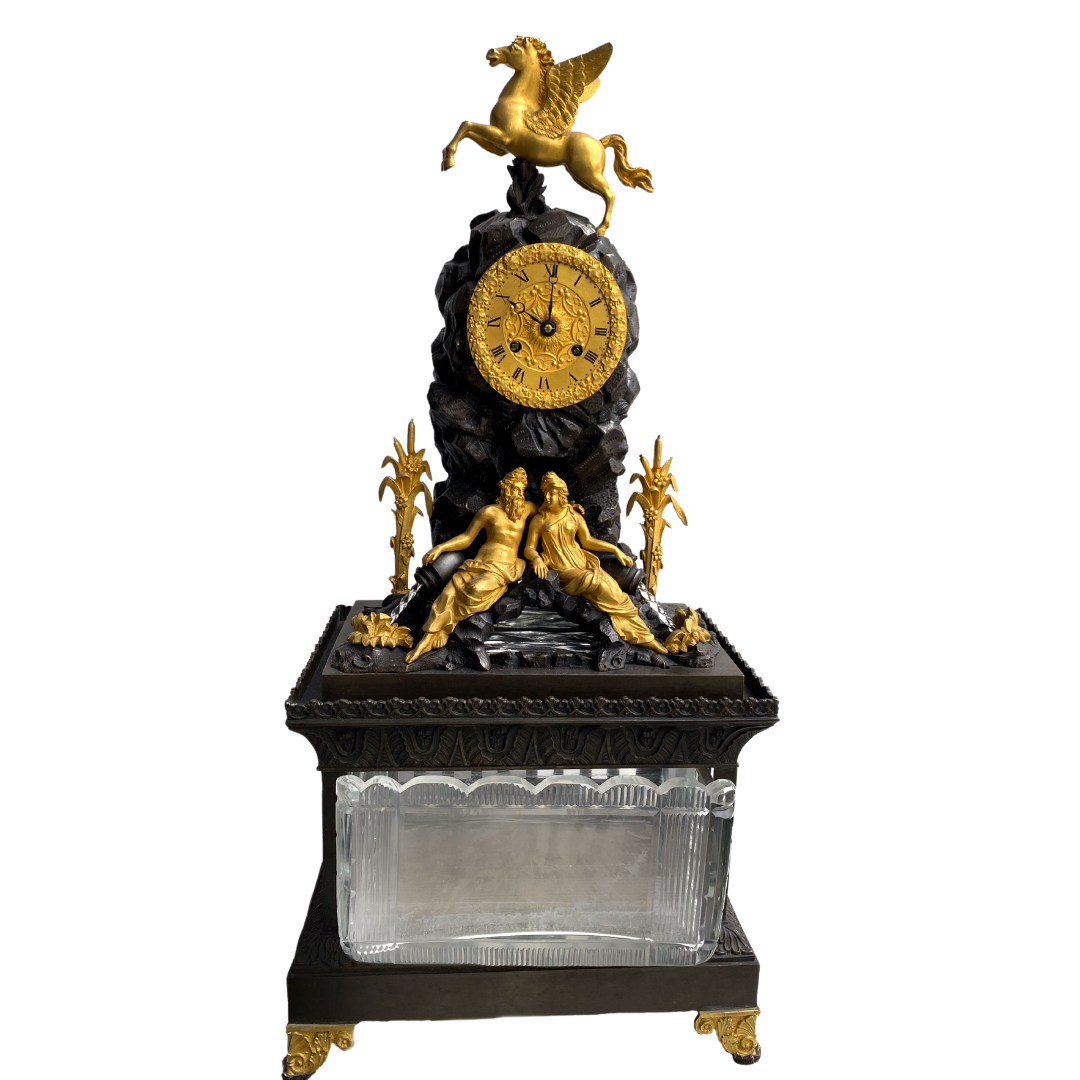 Это исключительный пример каминных часов в стиле французской империи начала 19 века, сочетающий элементы неоклассицизма с романтической интерпретацией мифологических тем.